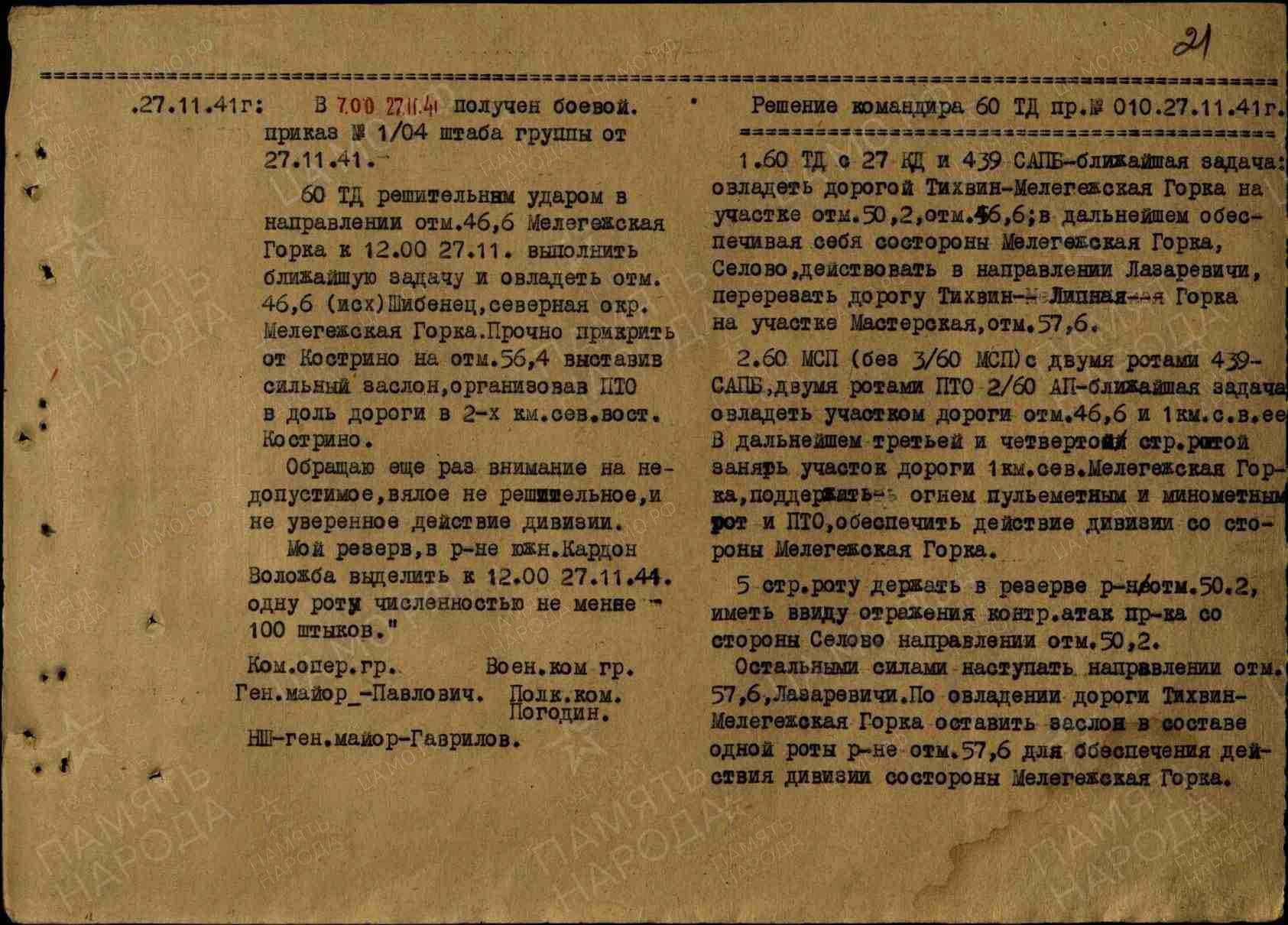 60 танковой дивизии решительным ударом в направлении отметки 46.6 и Мелегежская Горка к 12:00 27 ноября выполнить ближайшую задачу и овладеть отметкой 46.6 (исх) Шибенец и северной окраиной Мелегежской Горки. Прочно прикрыть от Кострино на отметке 56.4, выставив сильный заслон, организовав ПТО вдоль дороги в 2-х км северо-восточнее Кострино.