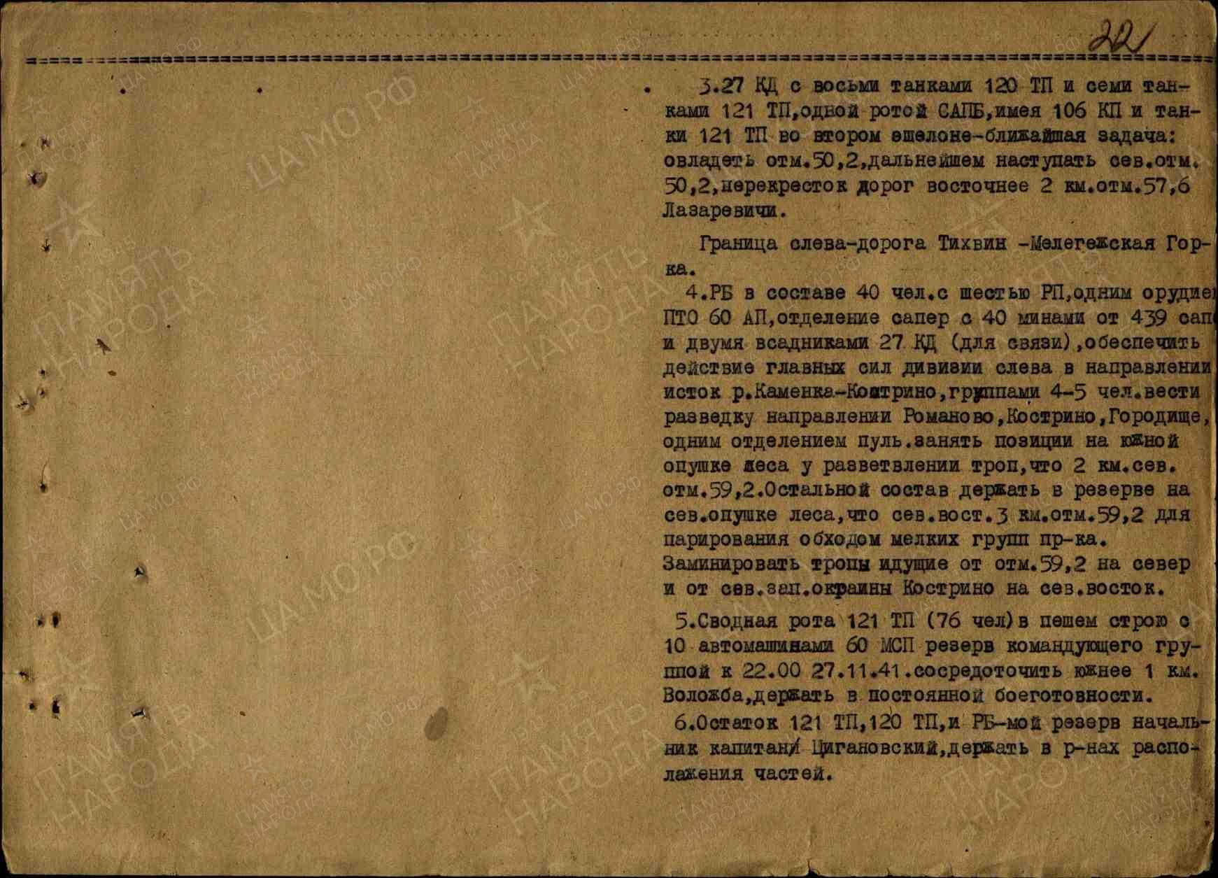 5. Сводная рота 121 ТП (76 человек) в пешем строю с 10 автомашинами 60 МСП - резерв командующего группой. Сосредоточиться к 22:00 27 ноября 1941 года в 1 км южнее Воложбы, пребывать в состоянии постоянной боеготовности.