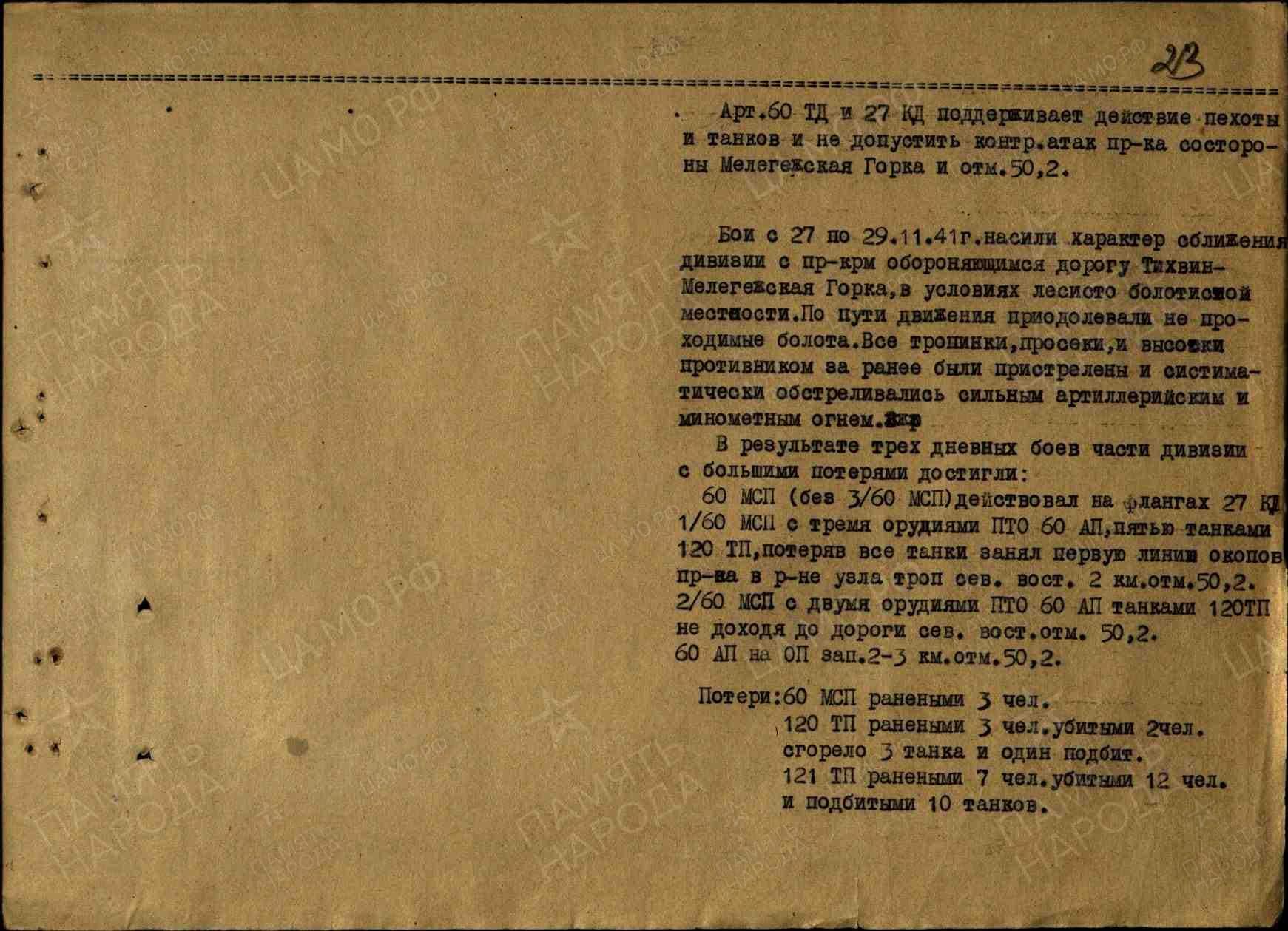 Артиллерии 60 ТД и 27 КД поддерживать действия пехоты и танков и не допускать контратак противника со стороны Мелегежской Горки и отметки 50.2.
