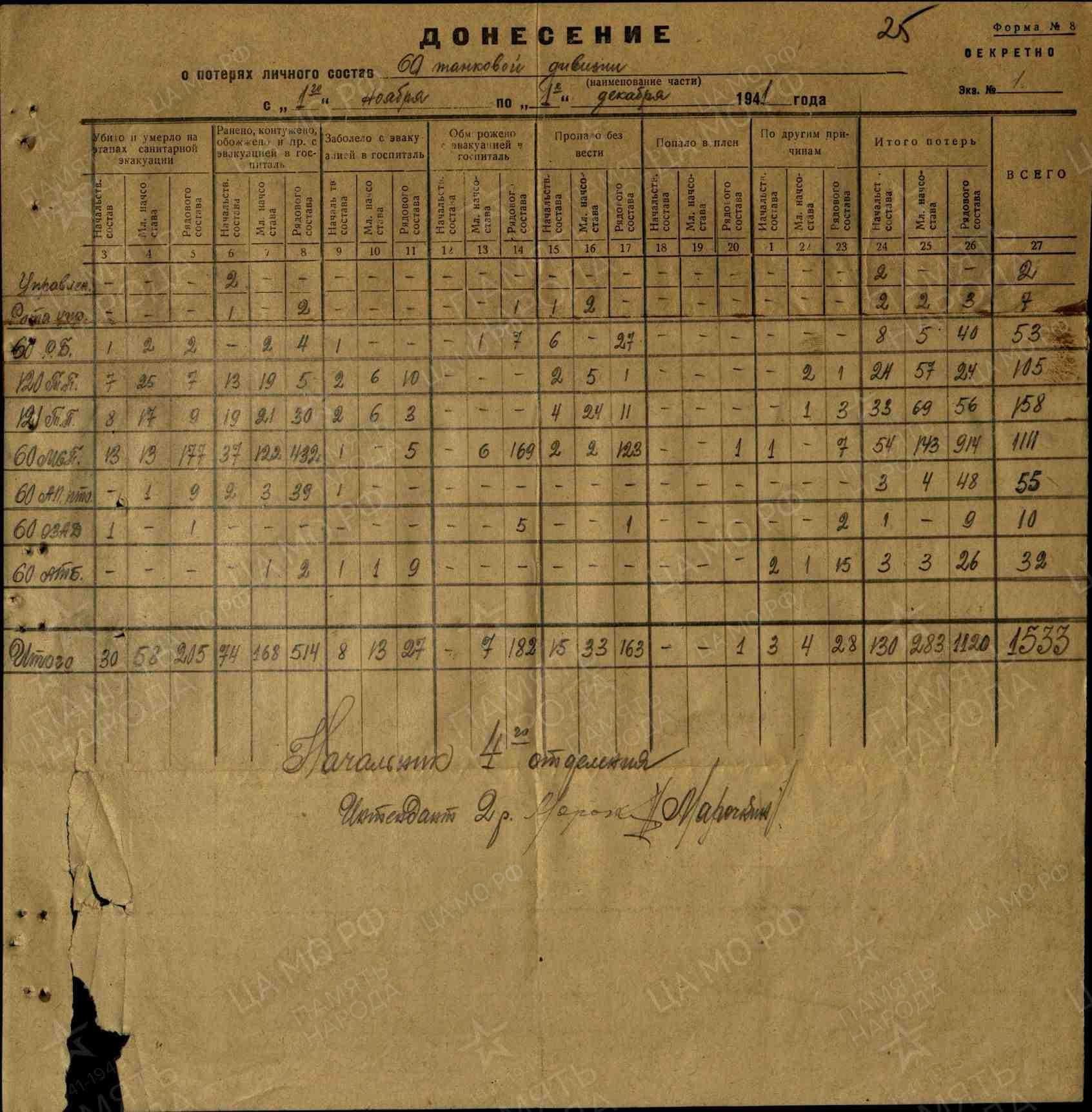 Донесение о потерях личного состава 60 танковой дивизии с 1 ноября по 1 декабря 1941 года
