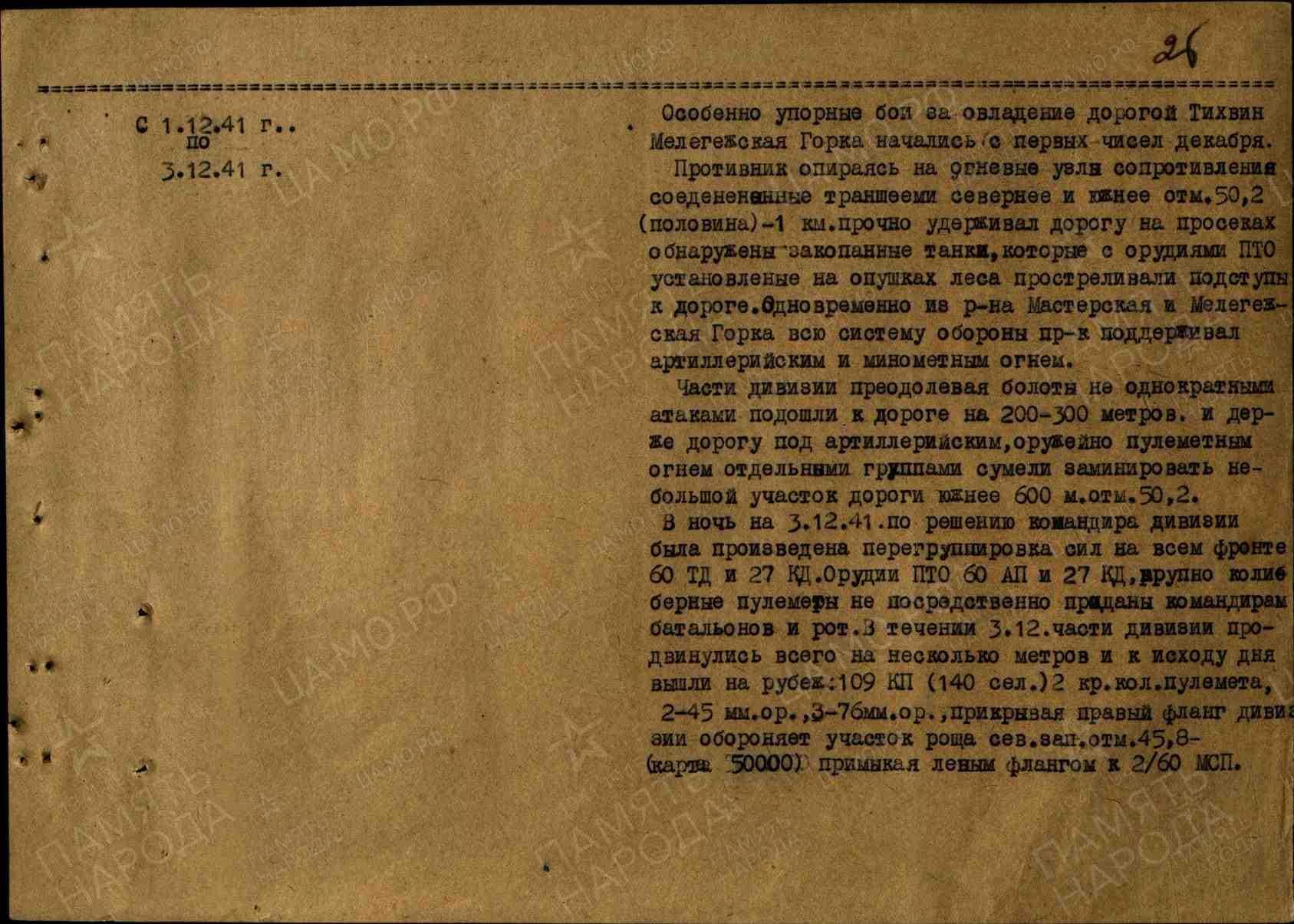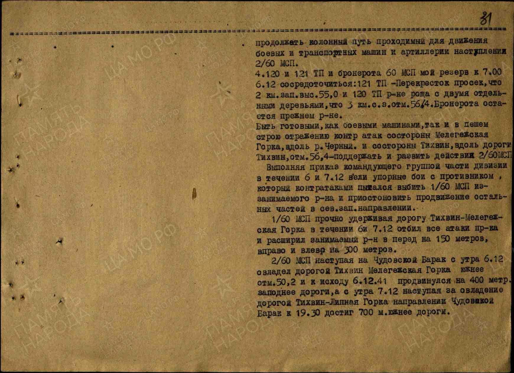 1/60 МСП, прочно удерживая дорогу Тихвин - Мелегежская Горка, в течение 06 и 07 декабря 1941 года отбил все атаки противника и расширил занимаемый район вперед на 150 метров, вправо и влево - на 300 метров.