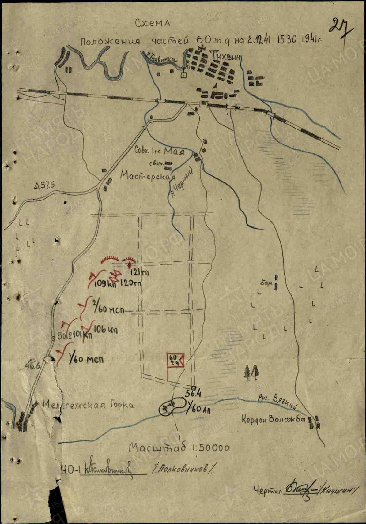 1. 60 ТД совместно с 27 КД и 439 САПБ. Ближайшая задача: овладеть дорогой Тихвин - Мелегежская Горка на участке отметки 50.2 и отметки 46.6.