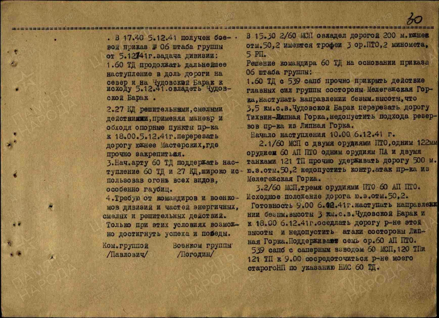 1. 60 ТД продолжать дальнейшее наступление вдоль дороги на север и на Чудовский Барак. К исходу 05 декабря 1941 года овладеть Чудовским Бараком.