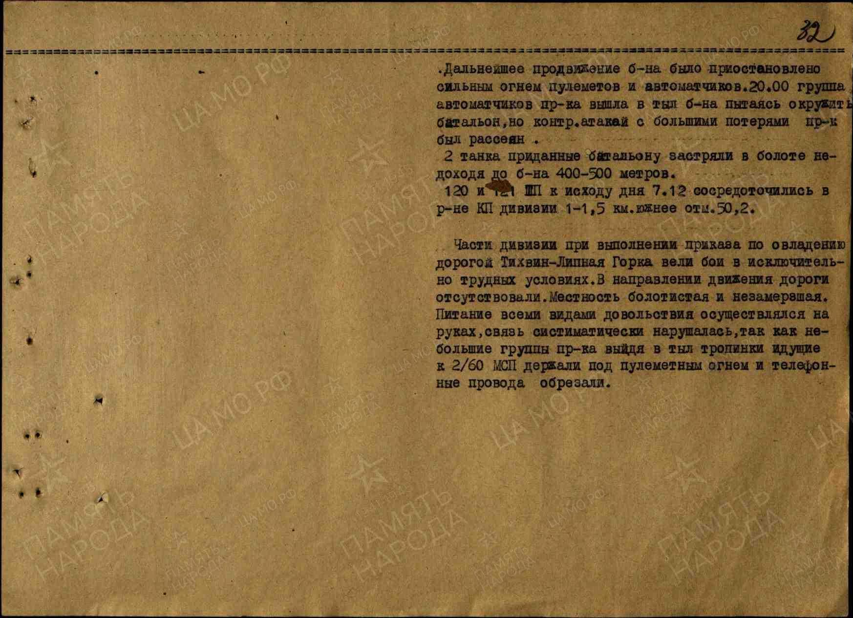 2/60 МСП наступал на Чудовский Барак. С утра 06 декабря 1941 года овладел дорогой Тихвин - Мелегежская Горка южнее отметки 50.2 и к исходу 06 декабря 1941 года продвинулся на 400 метров западнее дороги, а с утра 07 декабря 1941 года наступал за овладение дорогой Тихвин - Липная Горка в направлении Чудовский Барак. К 19:30 достиг 700 метров южнее дороги.