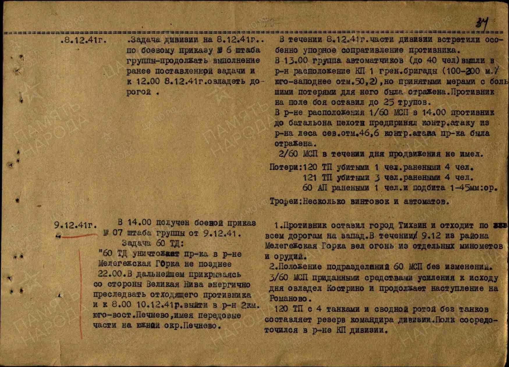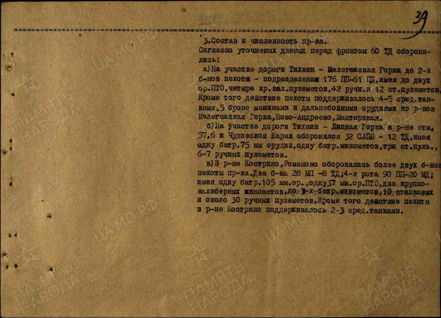 Теперь текст ЖБД 60 ТД с окончанием выводов из боевых действий под Тихвином за этот период 1941 года: