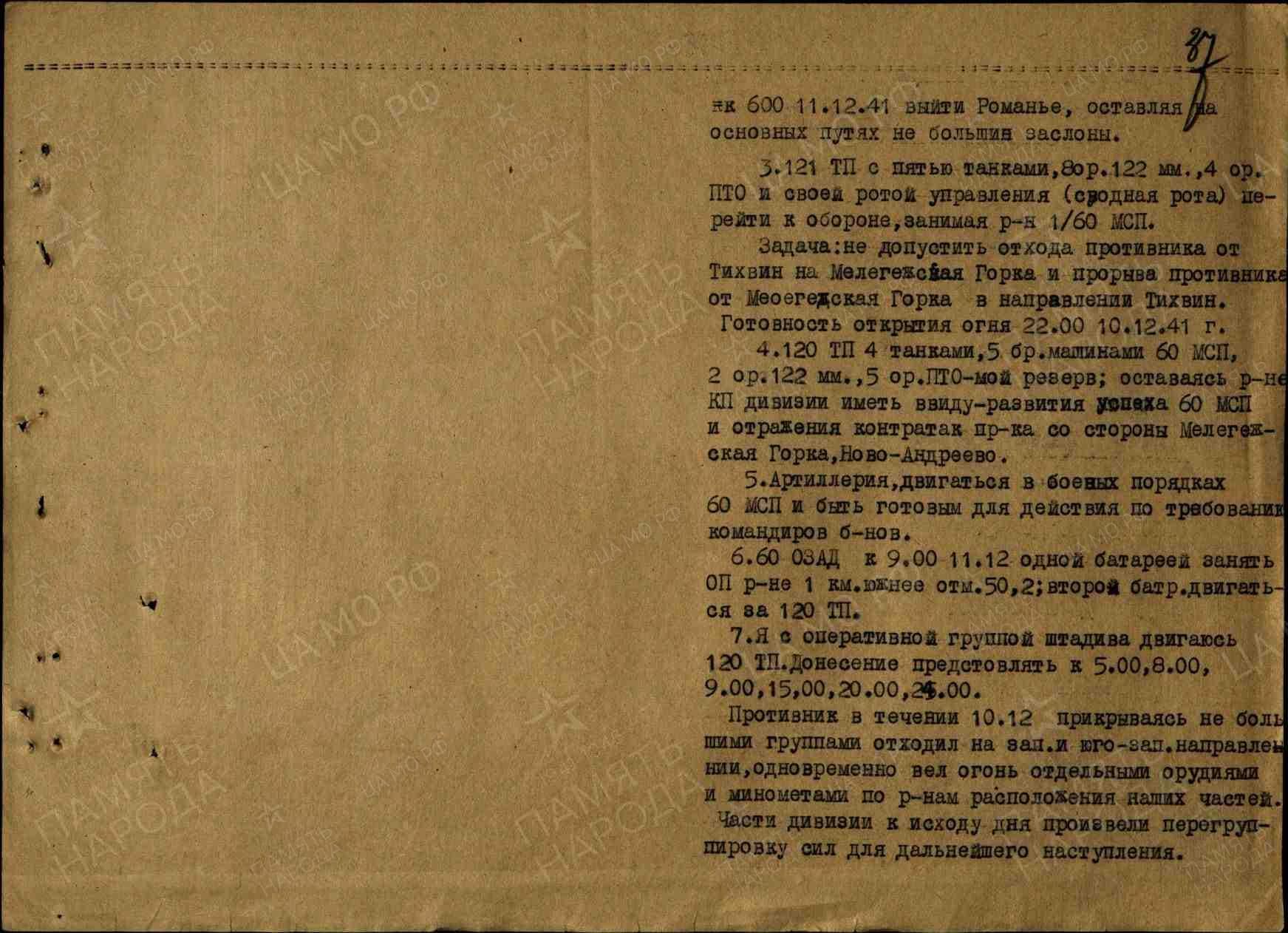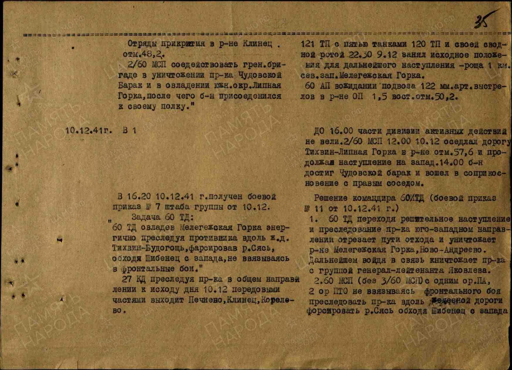 Решение командира 60 ТД (боевой приказ Nº 11 от 10 декабря 1941 года):