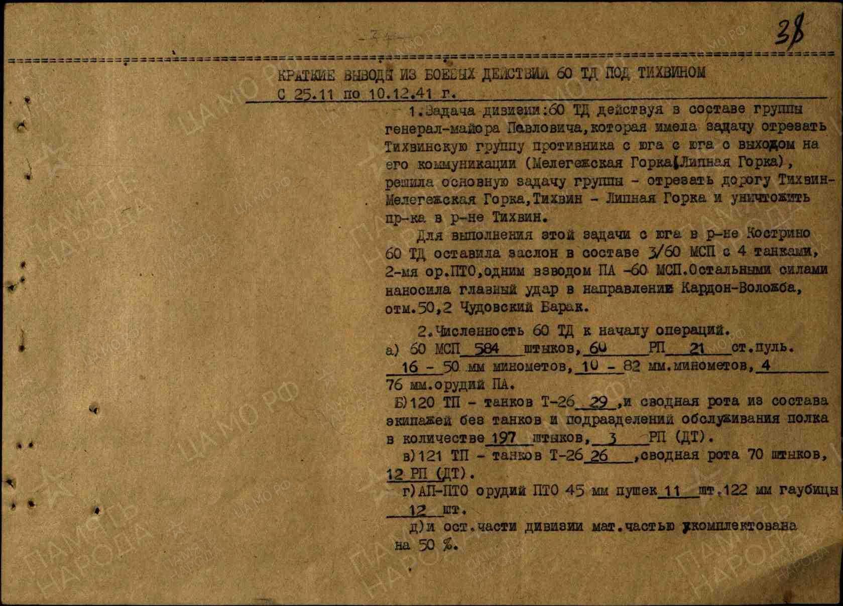 Краткие выводы из боевых действий 60 ТД под Тихвином с 25 ноября по 10 декабря 1941 года 1941 года.