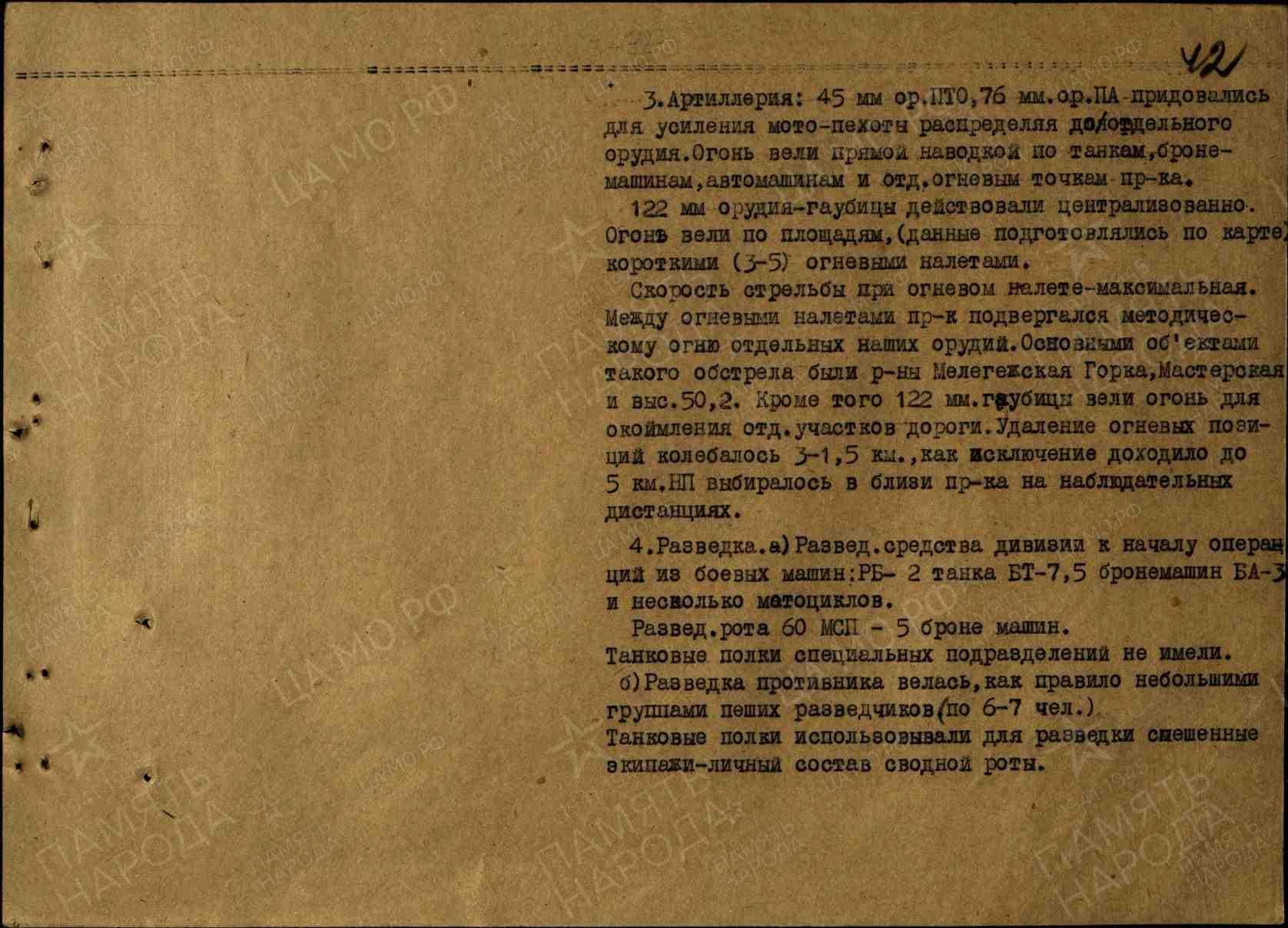 60 МСП (без 3/60 МСП - 105 человек) с одним орудием ПА, двумя орудиями ПТО в 21:00 выступил для выполнения поставленной задачи.