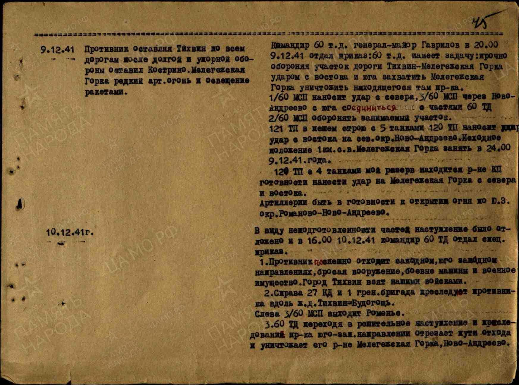 Командир 60 ТД генерал-майор Гаврилов в 20:00 09 декабря 1941 года отдал приказ: