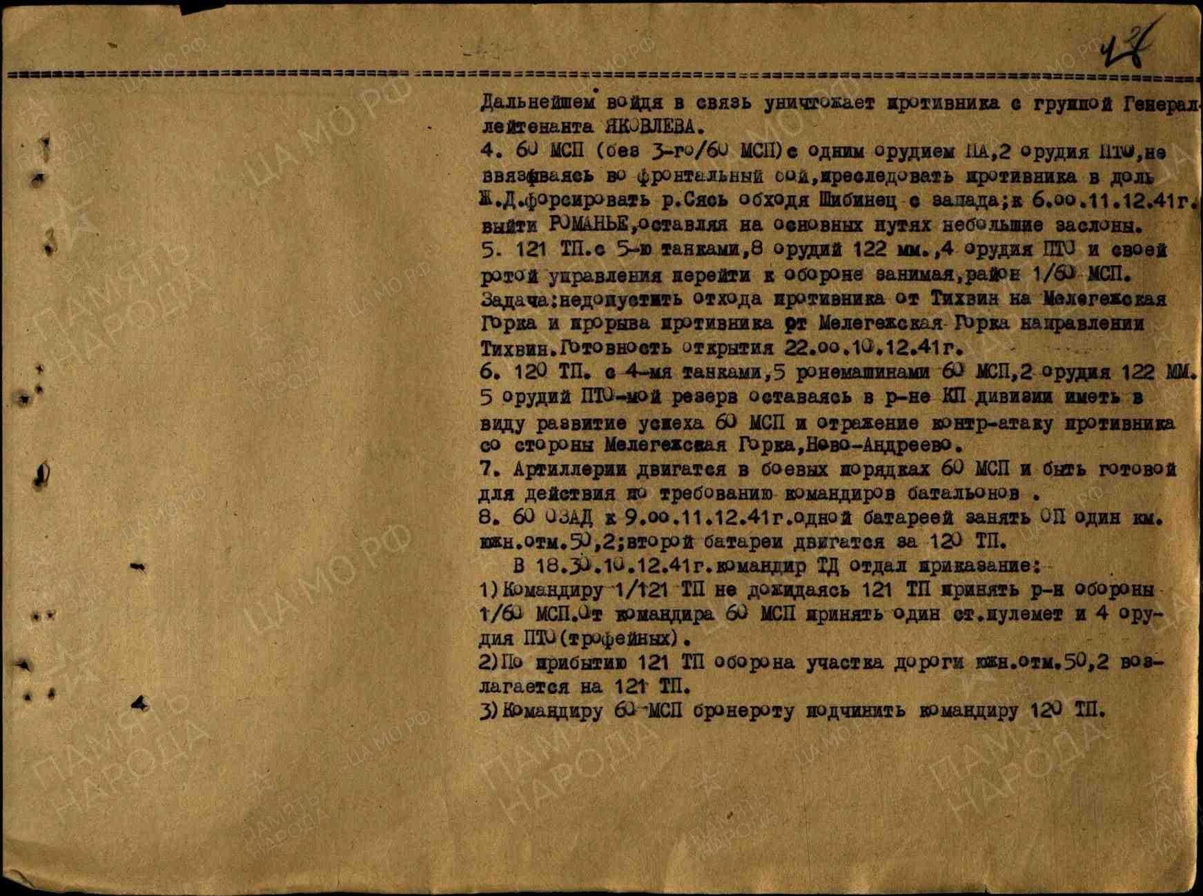 1. Командиру 1/121 ТП, не дожидаясь 121 ТП, принять район обороны 1/60 МСП. От командира 60 МСП принять один станковый пулемет и 4 орудия ПТО (трофейных).