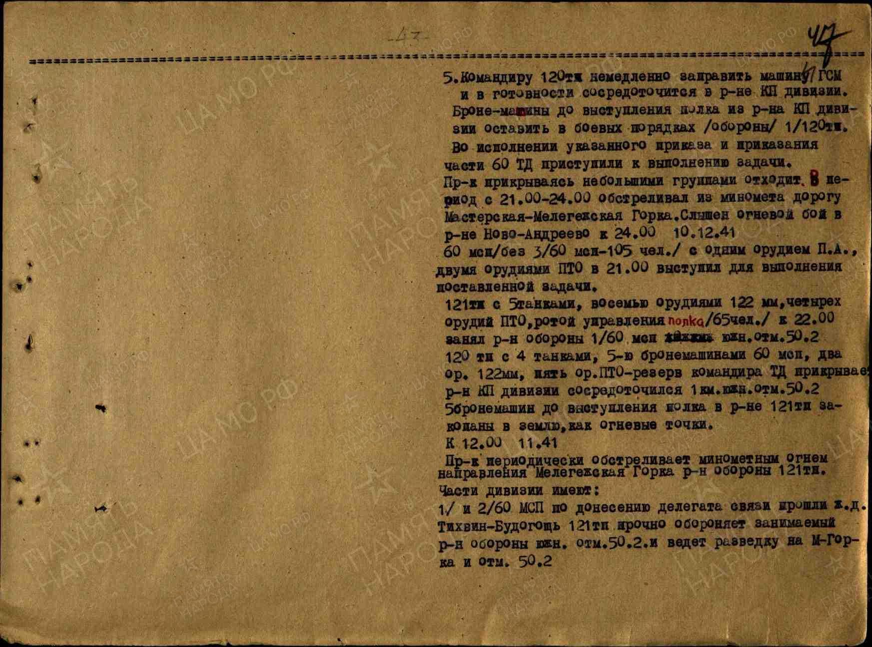 121 ТП в пешем строю с 5 танками 120 ТП наносит удар с востока на северной окраине Ново-Андреево. Исходное положение в 1 км северо-восточнее Мелегежская Горка занять в 24:00 09 декабря 1941 года.