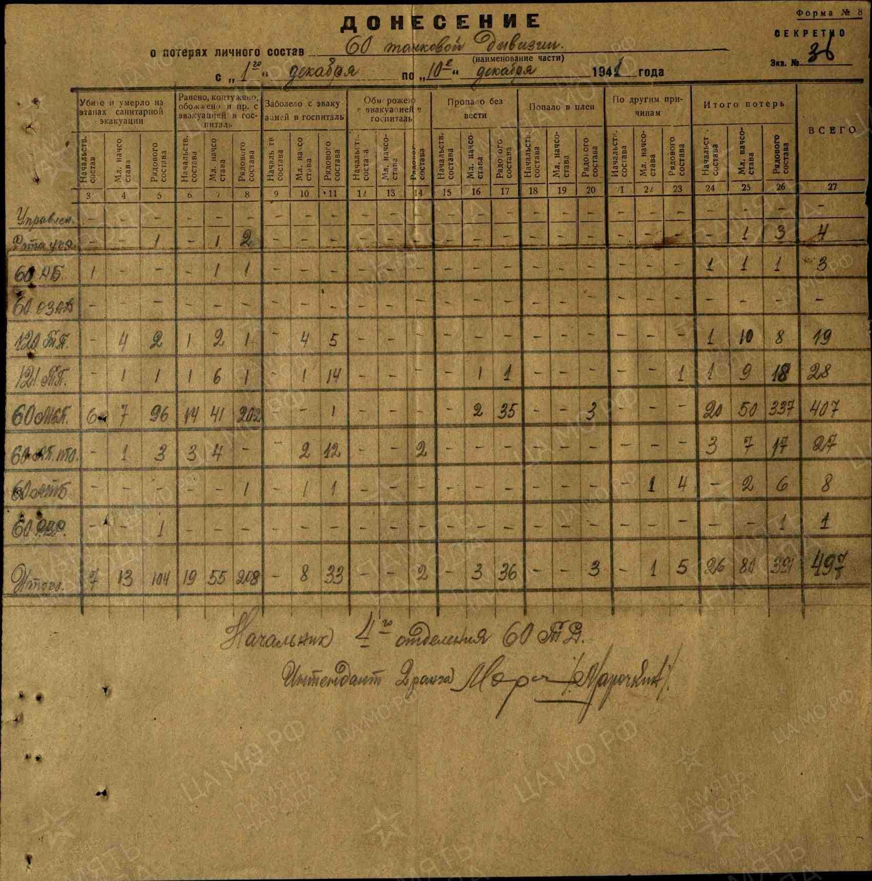 Донесение о потерях личного состава 60 танковой дивизии с 1 декабря по 10 декабря 1941 года