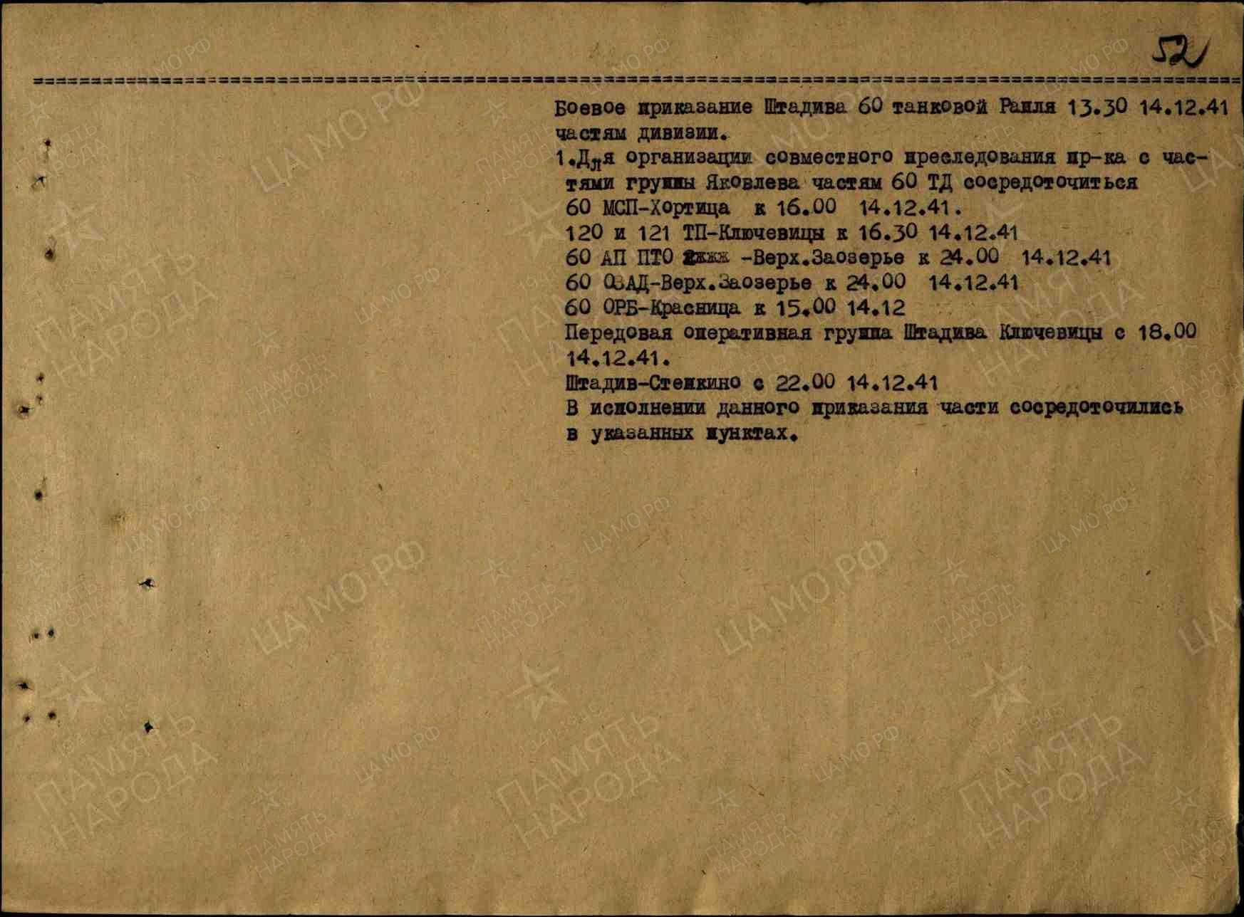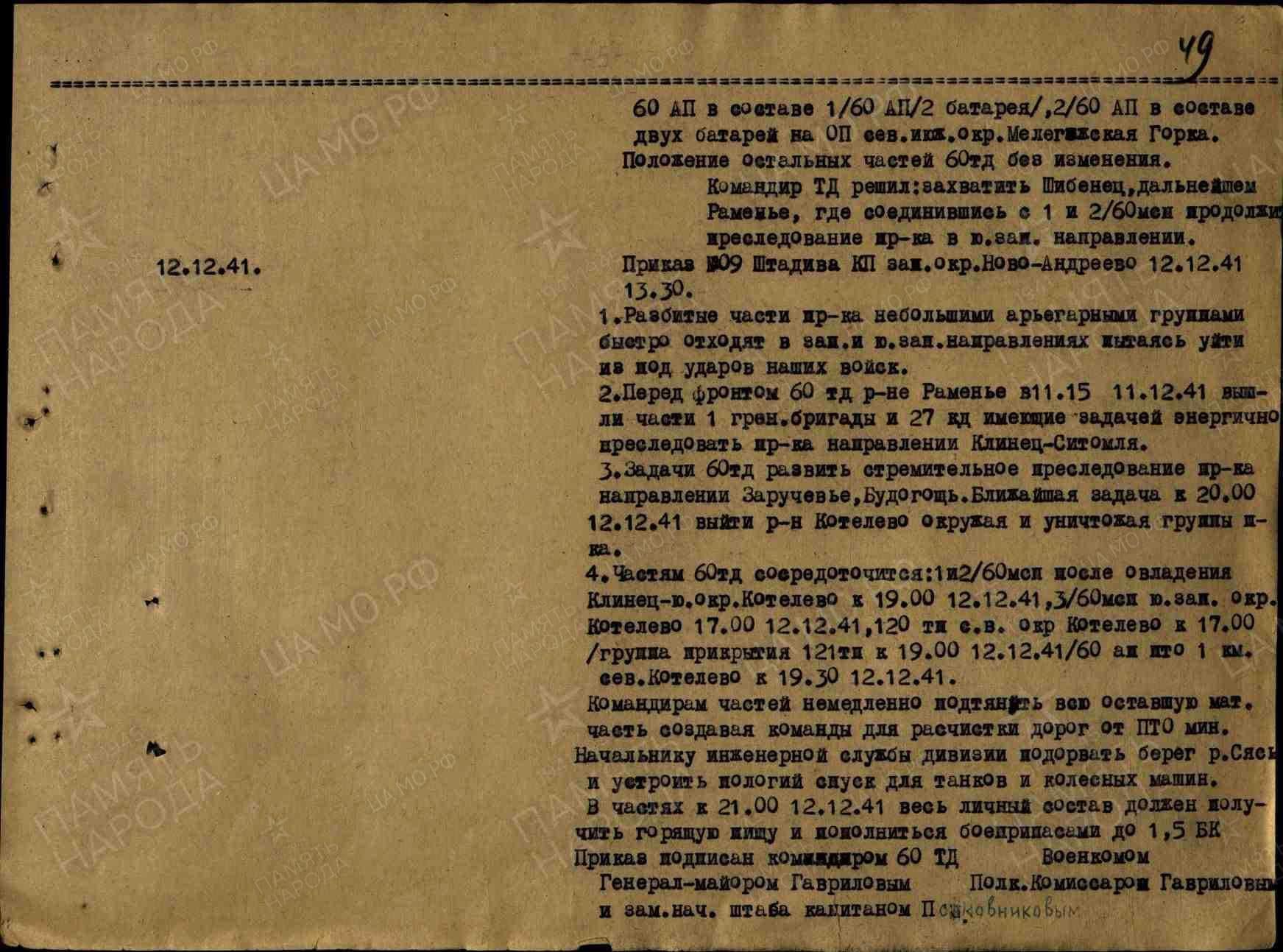 Приказ подписан командиром 60 ТД генерал-майором Гавриловым, военкомом полковым комиссаром Гавриловым и зам. начальника штаба капитаном Полковниковым.