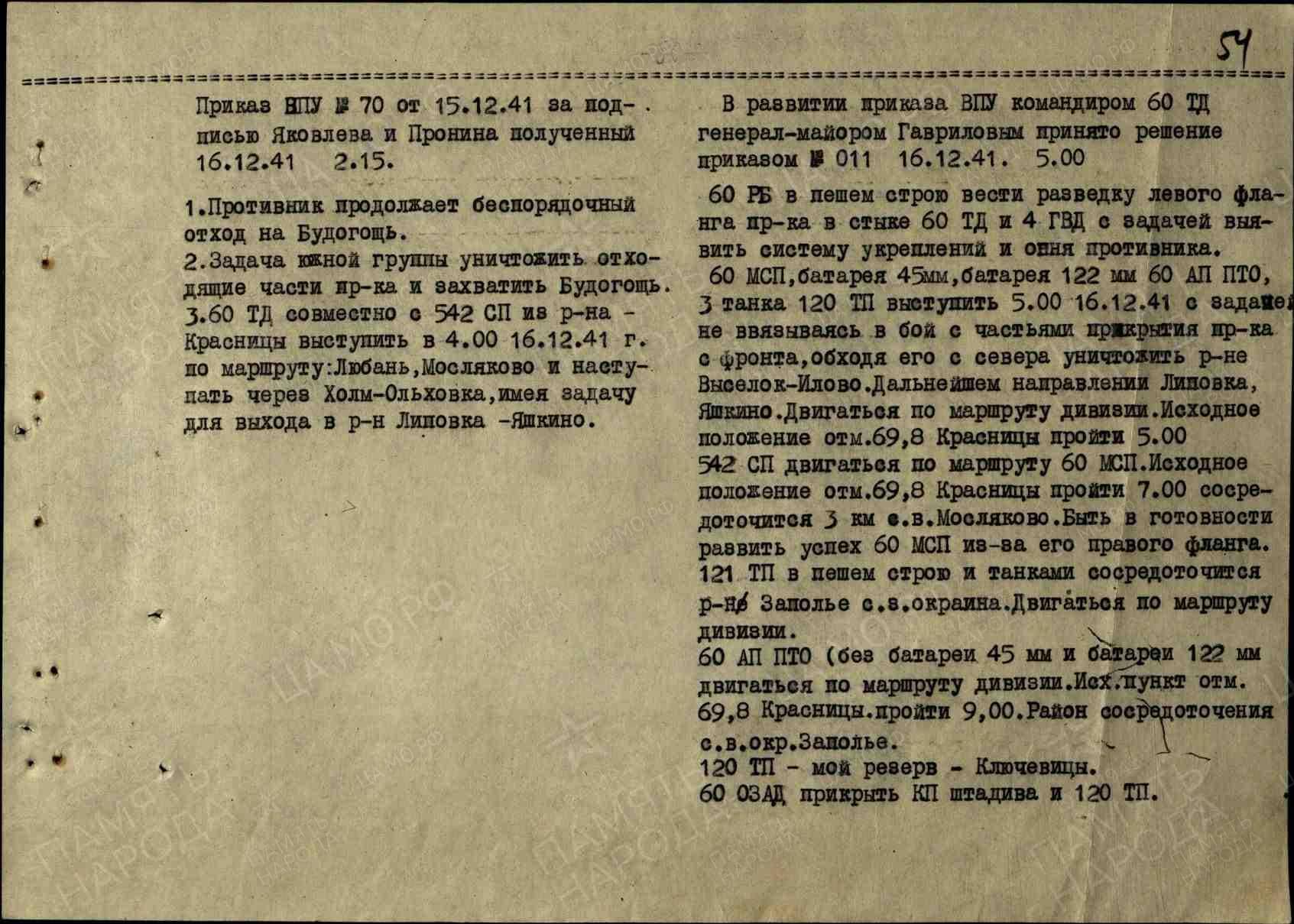 В развитие приказа ВПУ командиром 60 ТД генерал-майором Гавриловым принято решение приказом Nº 011 от 05:00 16 декабря 1941 года: