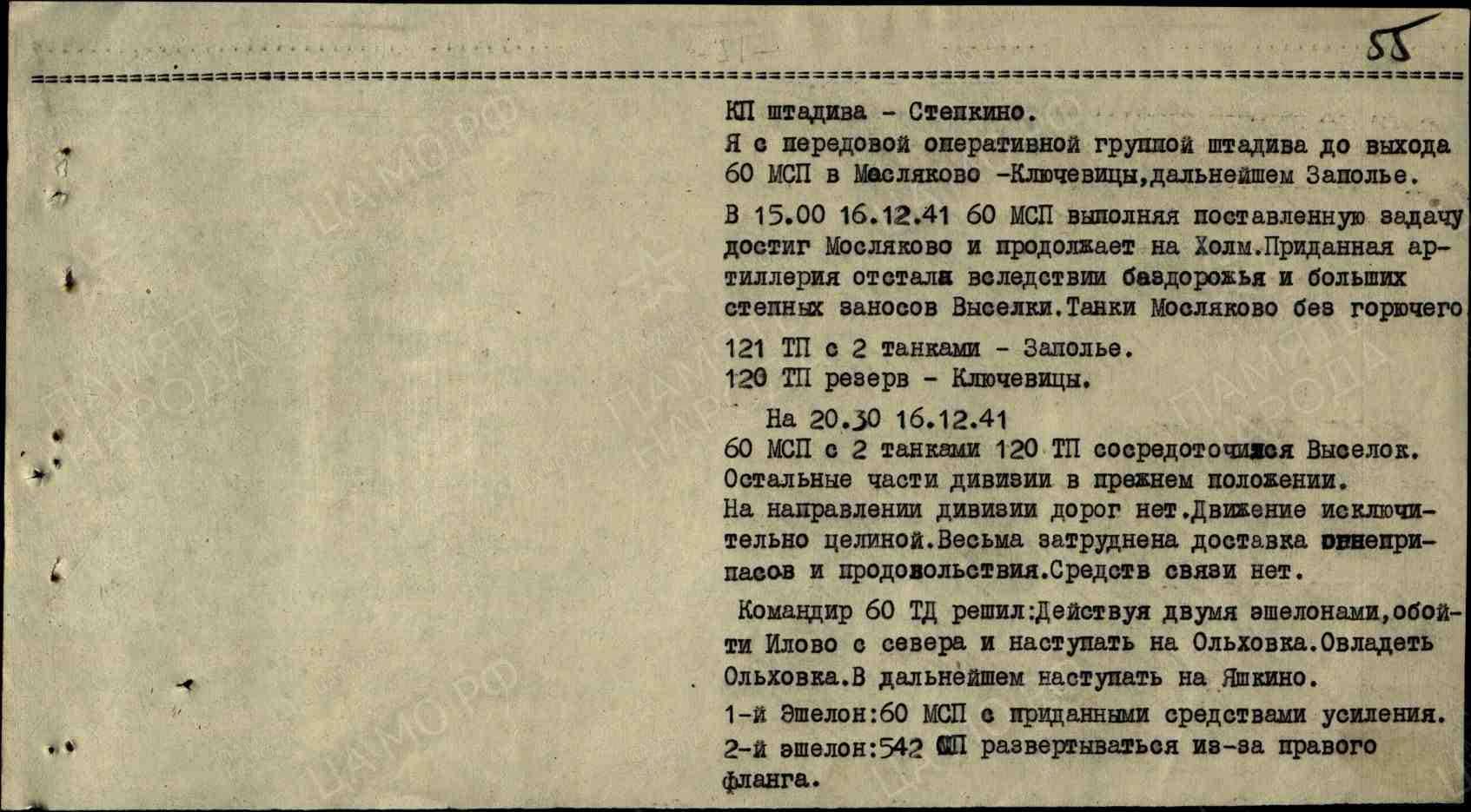 В 15:00 16 декабря 1941 года 60 МСП, выполняя поставленную задачу, достиг Мосляково и продолжает движение на Холм. Приданная артиллерия отстала вследствие бездорожья и больших степных заносов в Выселки. Танки - в Мосляково без горючего.