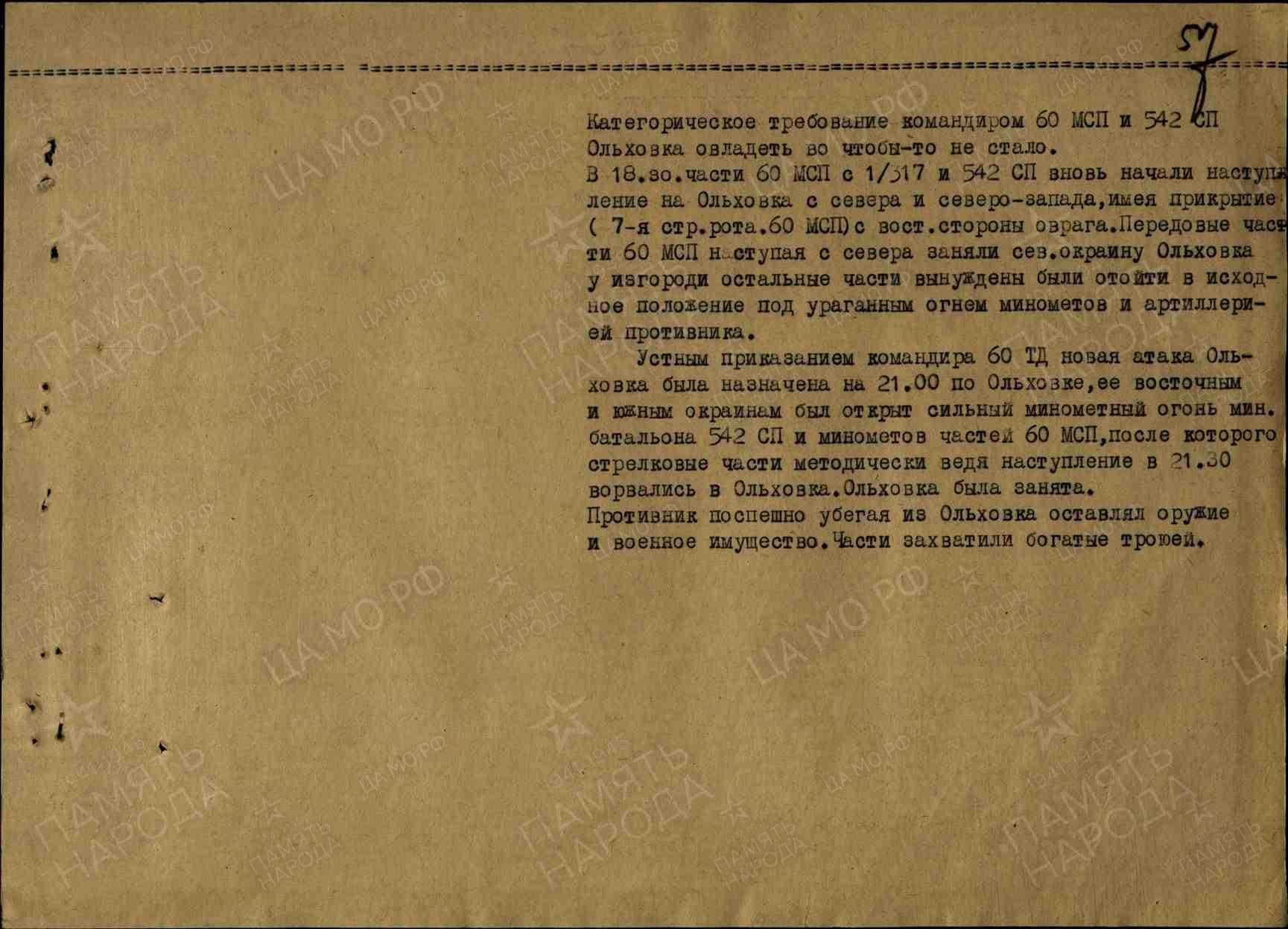 Приказом командира 60 ТД, прикрываясь 7-й ротой, остальным частям 60 МСП продвинуться вдоль оврага на север в район Сар в 1 км северо-восточнее Ольховка и, заняв пунктирную дрогу, привести себя в порядок, готовясь к решительному наступлению на Ольховка с севера и северо-востока.