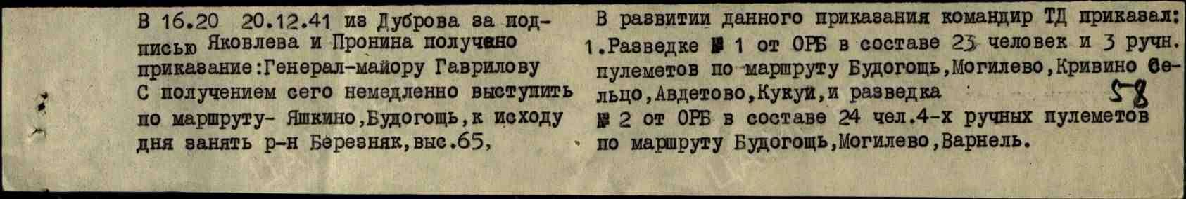 В 16:20 20 декабря 1941 года из Дуброва за подписью Яковлева и Пронина получено приказание: