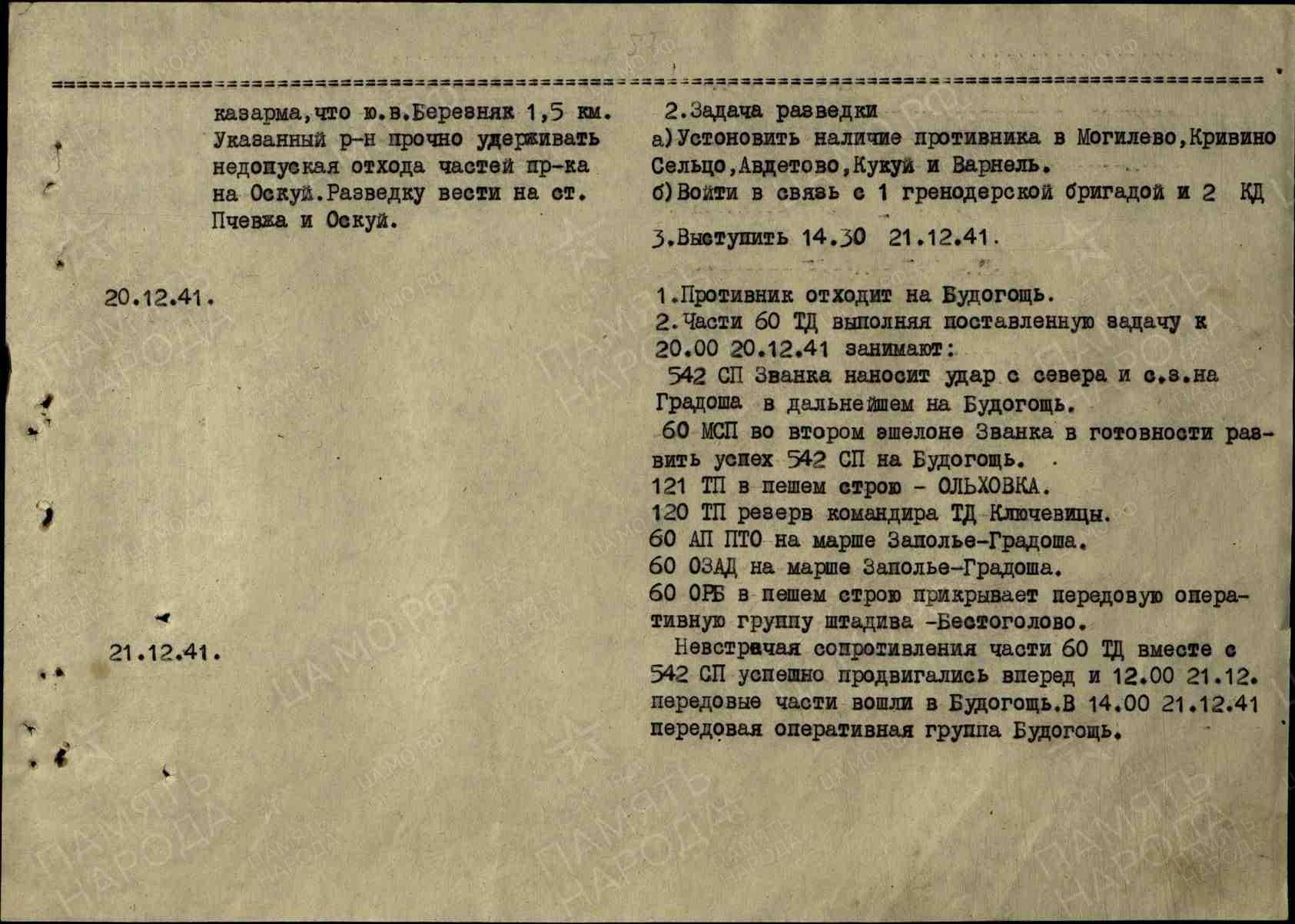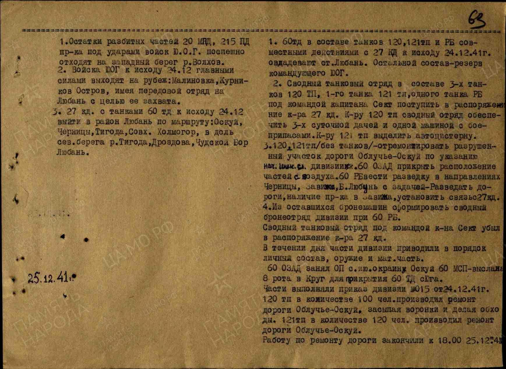 Во исполнение настоящего приказа части 60 ТД к 24:00 21 декабря 1941 года занимают: