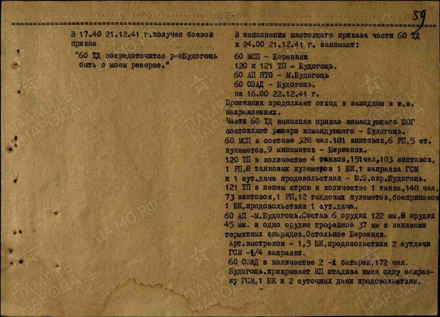 Теперь текст ЖБД 60 ТД за 21 декабря 1941 года: