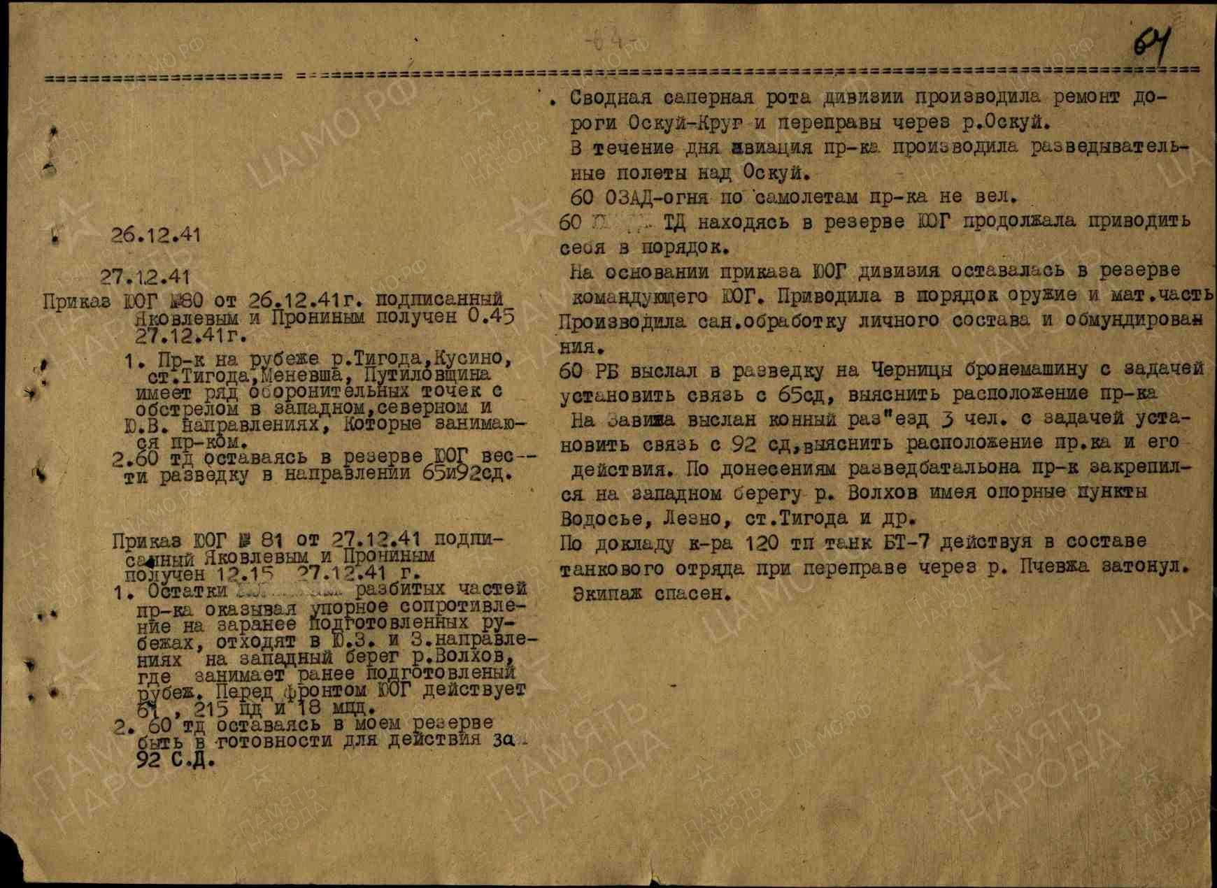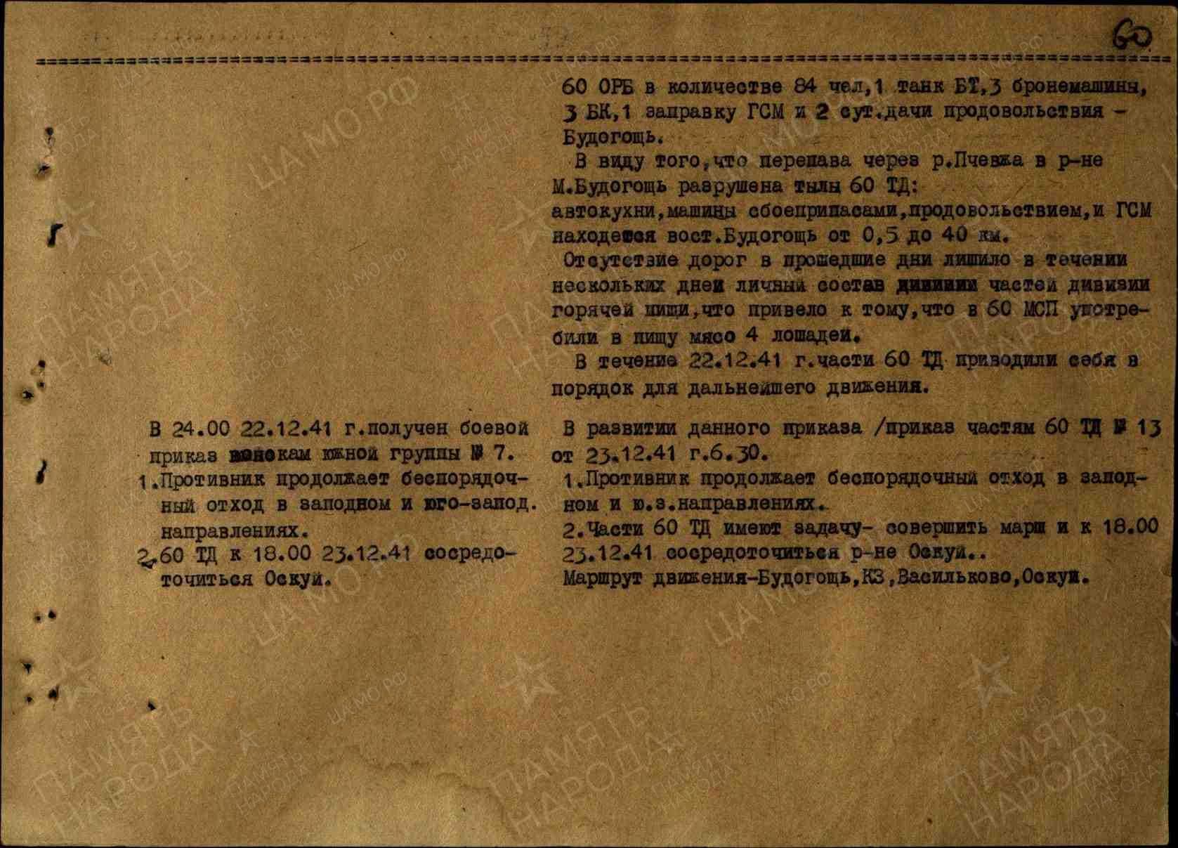 В развитие данного приказа в 06:30 отдан приказ частям 60 ТД Nº 13 от 23 декабря 1941 года: