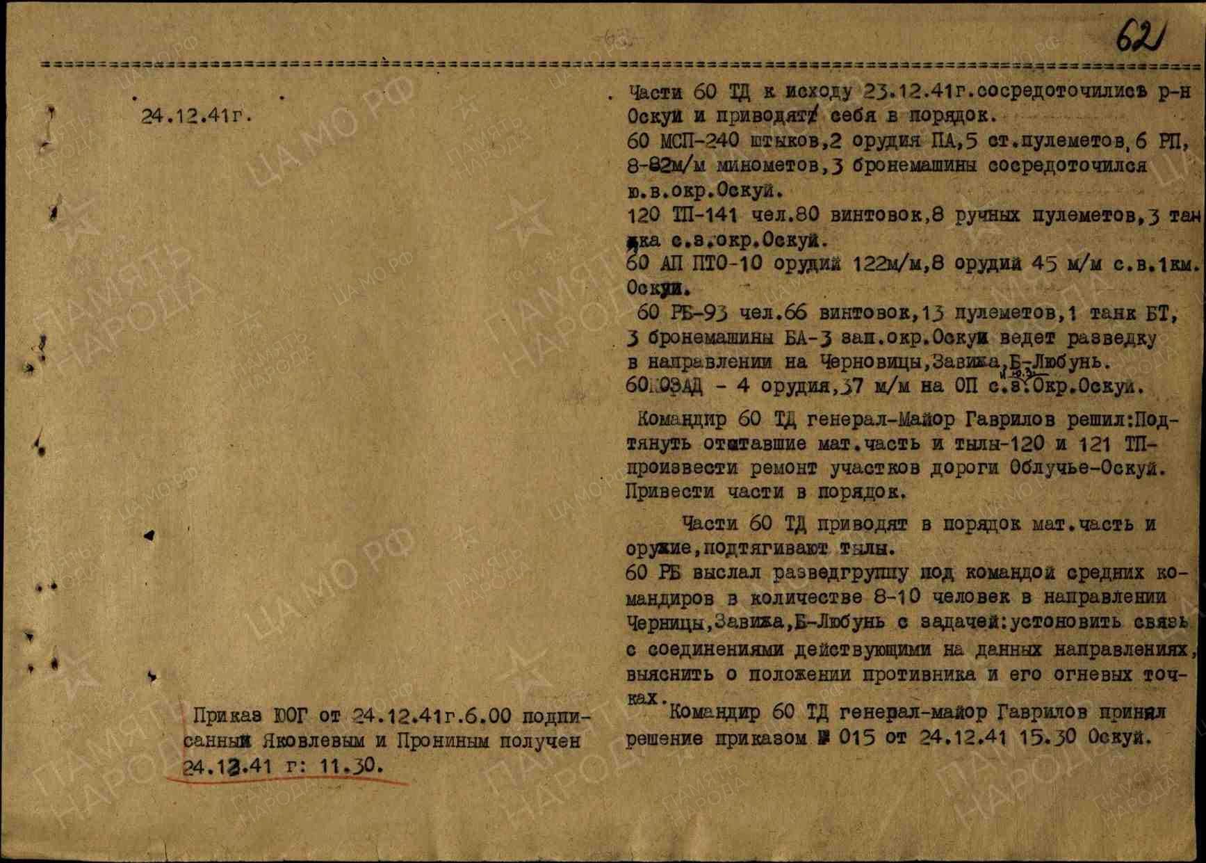 Командир 60 ТД генерал-майор Гаврилов принял решение приказом Nº 015 в Оскуе в 15:30 24 декабря 1941 года: