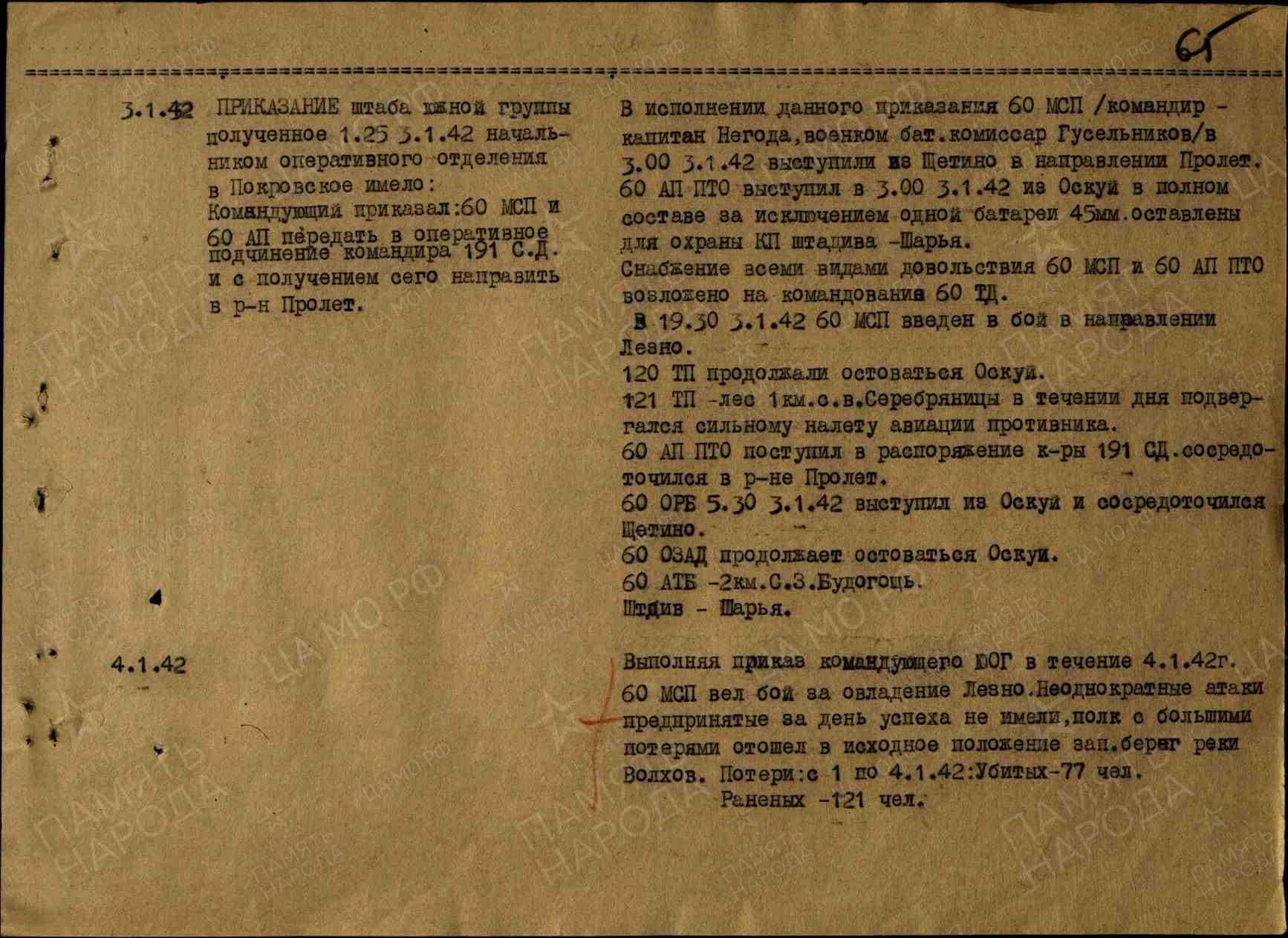 В исполнение данного приказания 60 МСП (командир - капитан Негода, военком батальонный комиссар Гусельников) в 03:00 03 января 1942 года выступили на Щетино в направлении Пролет.