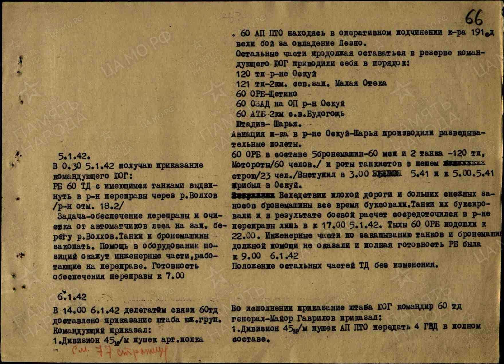 Примечание: часть текста ЖБД 60 ТД относительно своей деятельности 06 января 1942 года по неизвестной нам причине приводится в начале другого листа документа, о котором речь пойдет несколько позднее: