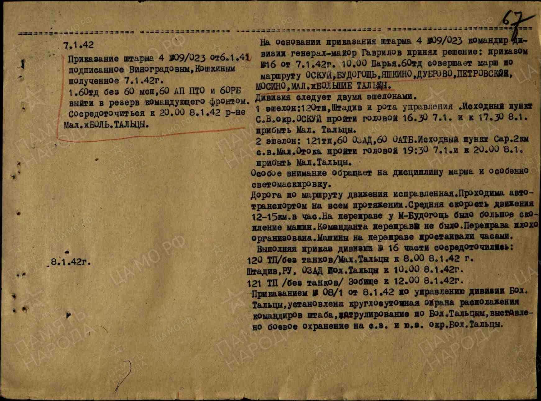 В 14:00 06 января 1942 года делегатом связи 60 ТД доставлено приказание Штаба Южной Группы. Командующий приказал: