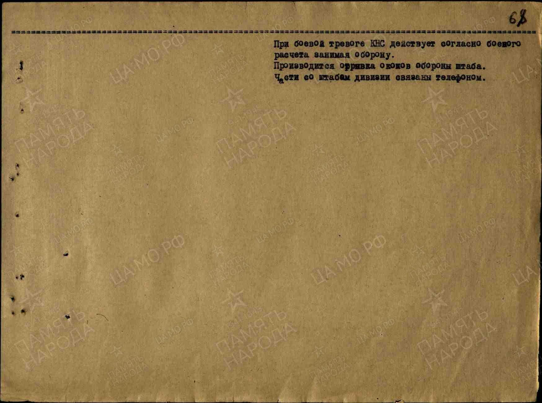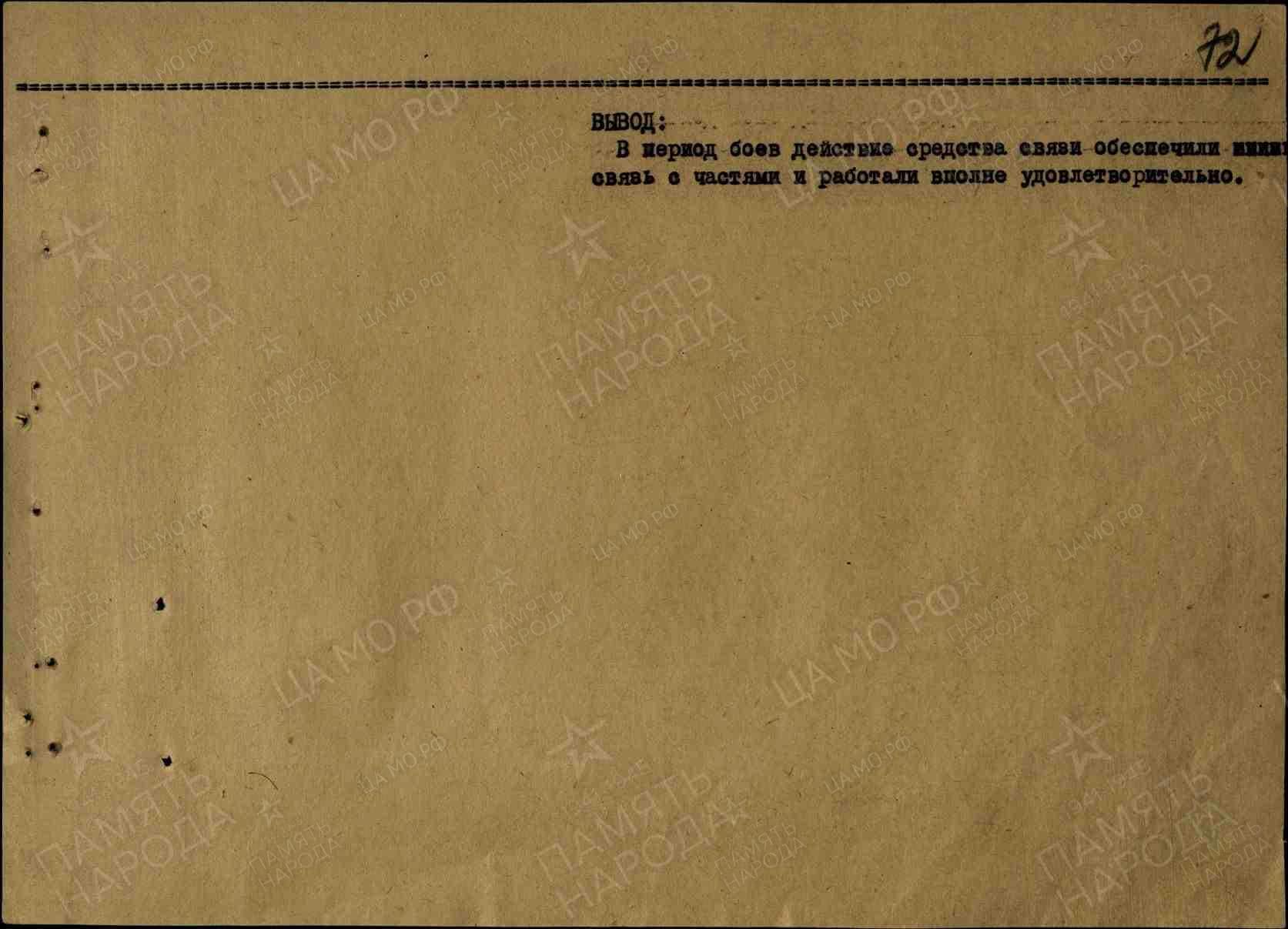 Для связи с частями использовались попутные машины и периодически выделялись. Пункт сбора донесений был в лице одного красноармейца тов. Галушкина, лично который работал хорошо, но подвижных средств связи постоянных не имел.