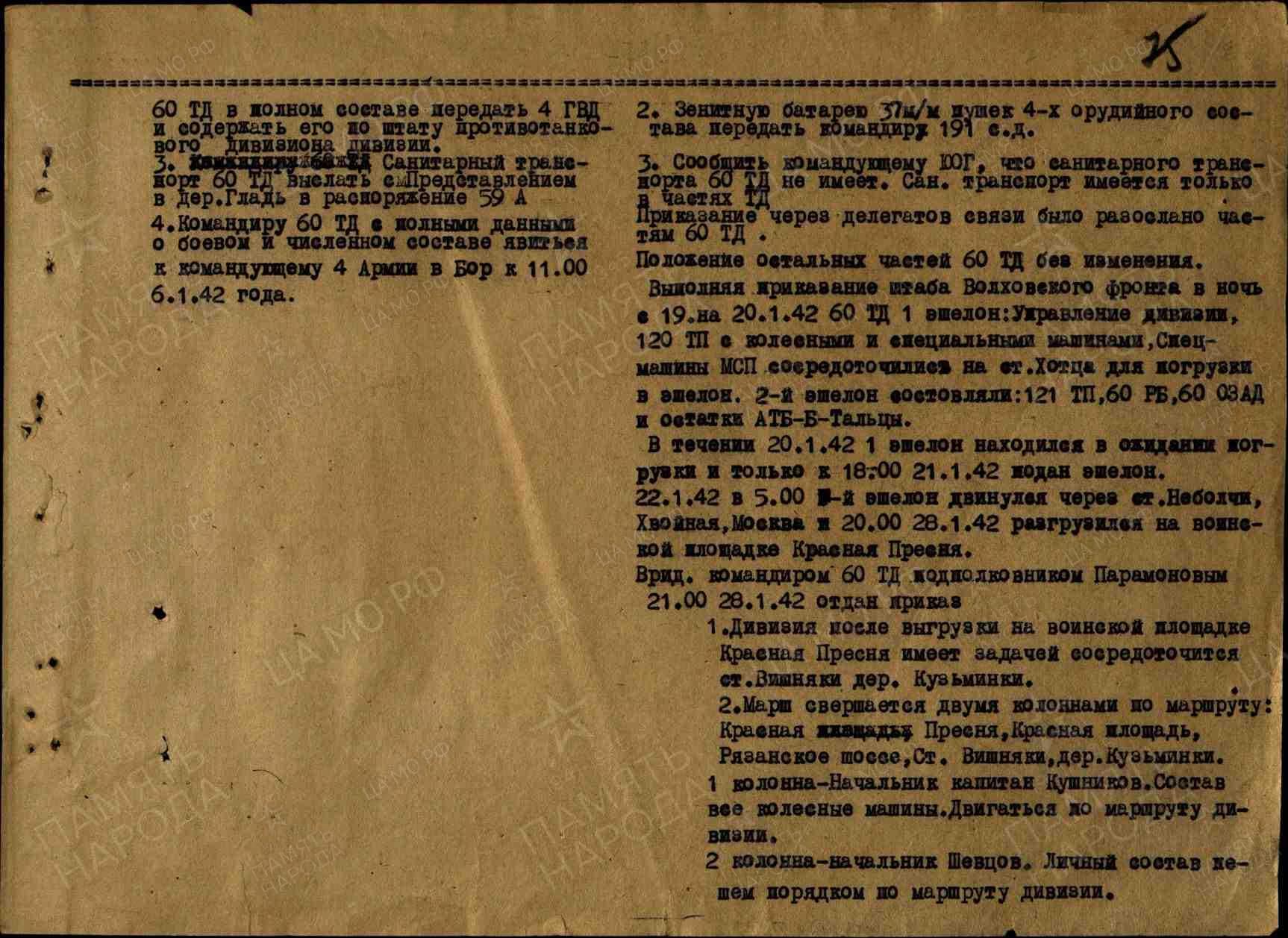4. Командиру 60 ТД с полными данными о боевом и численном составе явиться к командующему 4 Армии в Бор к 11:00 06 января 1942 года.