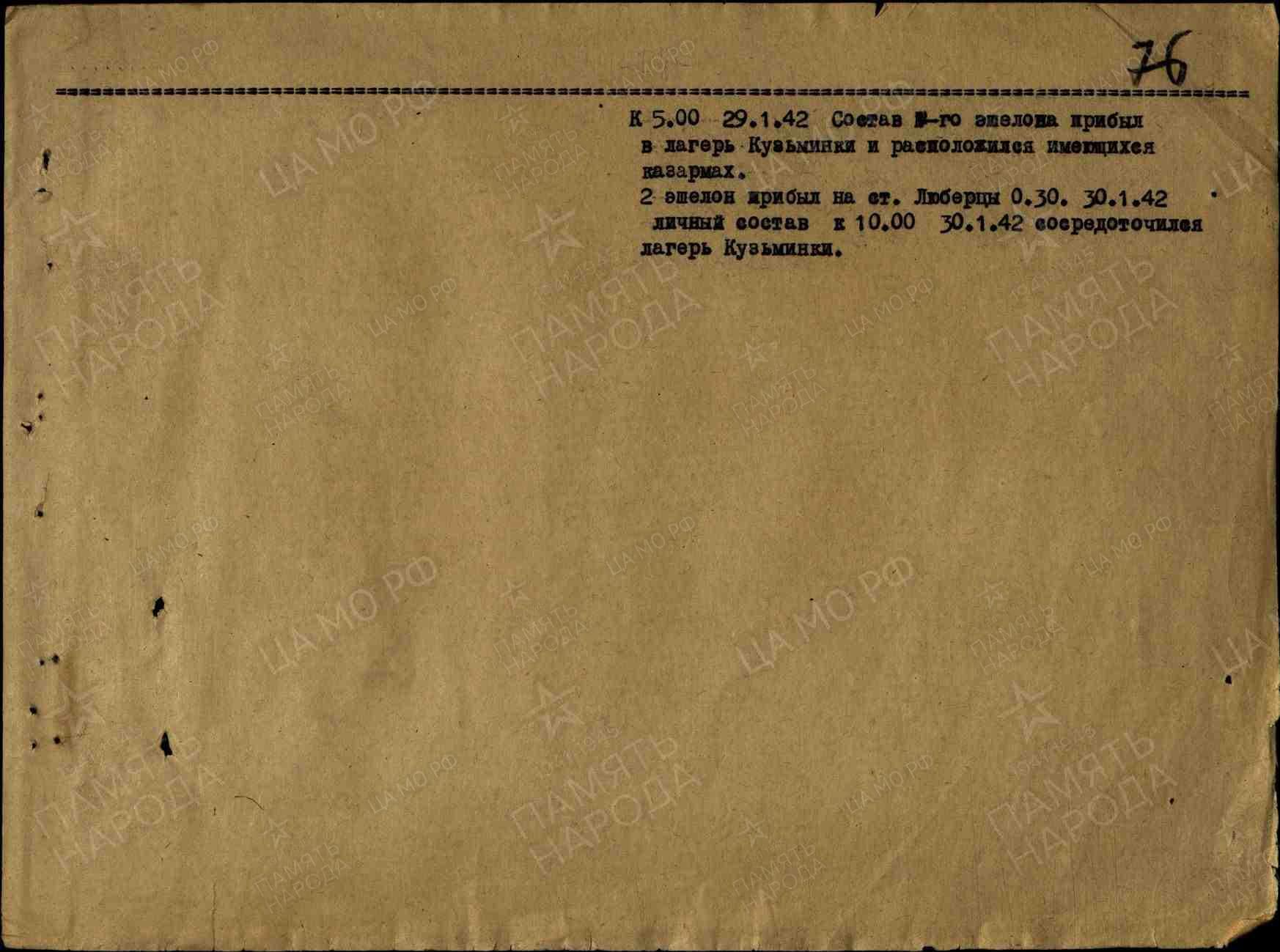 2 эшелон прибыл на станцию Люберцы в 0:30 30 января 1942 года, личный состав к 10:00 30 января 1942 года сосредоточился в лагере Кузьминки.