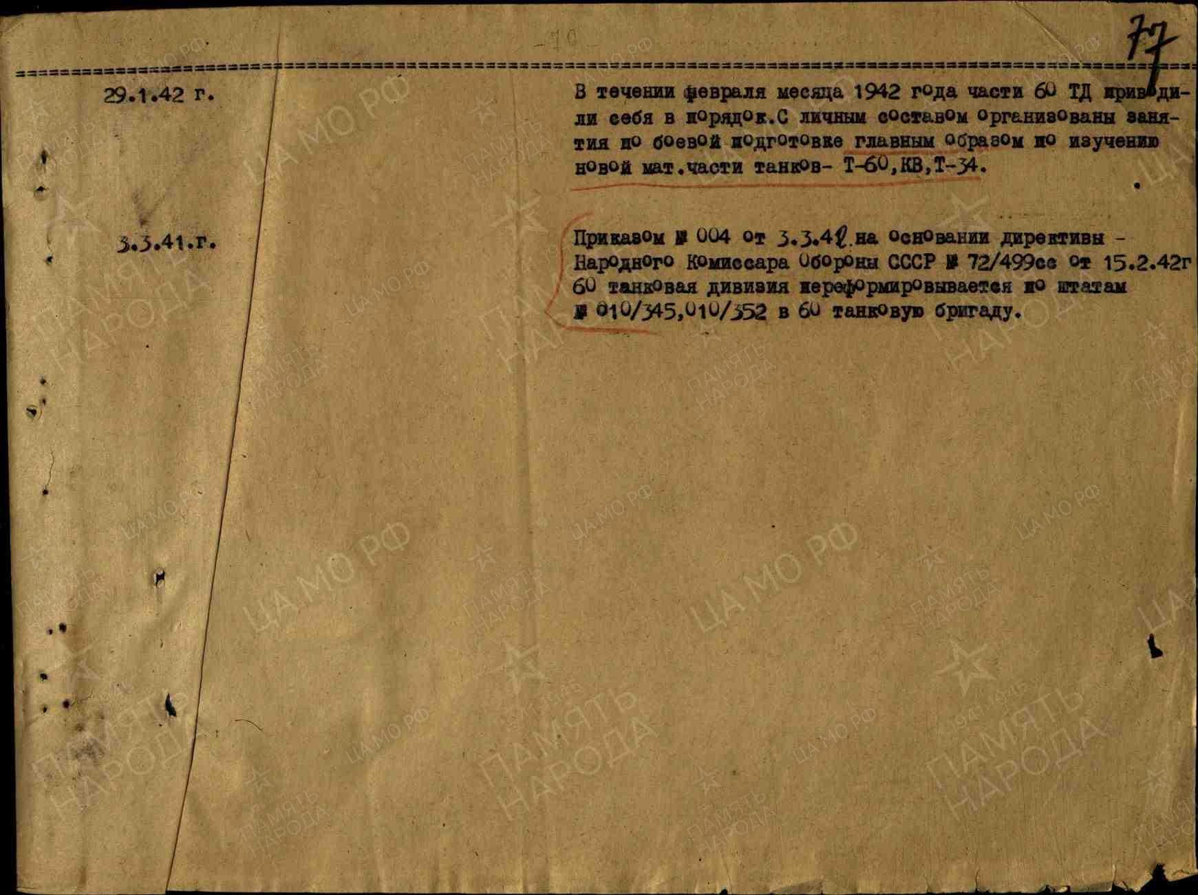 Приказом Nº 004 от 03 марта 1942 года на основании Директивы Народного Комиссара Обороны СССР Nº 72/499сс от 15 февраля 1942 года 60 танковая дивизия переформировывается по штатам Nº 010/345, 010/352 в 60 танковую бригаду.