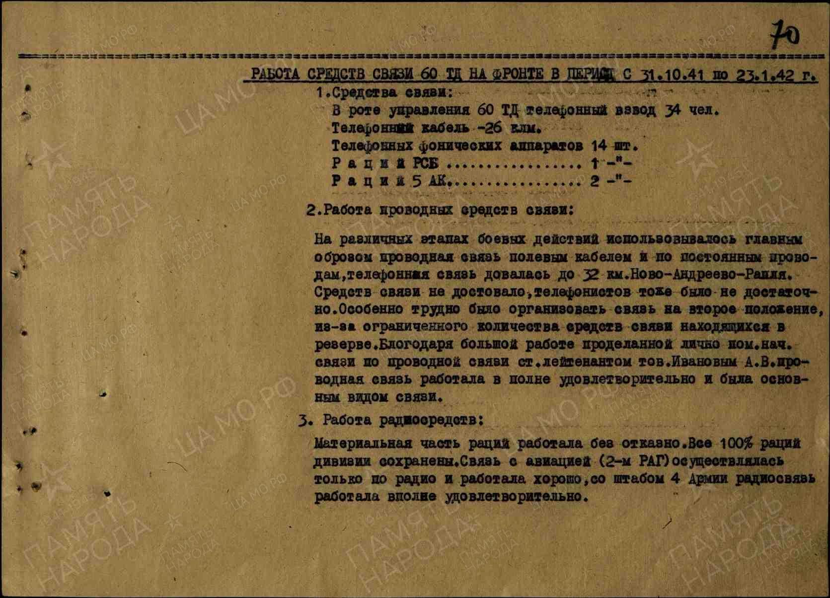 Работа средств связи 60 ТД на фронте в период с 31 октября 1941 года по 23 января 1942 года.