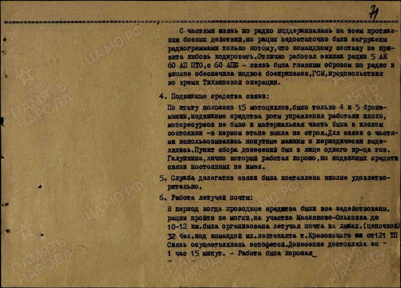 Отлично работал экипаж рации 5 АК 60 АП ПТО, с 60 АТБ - связь главным образом по радио и вполне обеспечила подвоз боеприпасов, ГСМ и продовольствия во время Тихвинской операции.