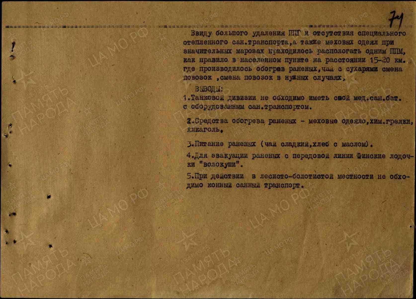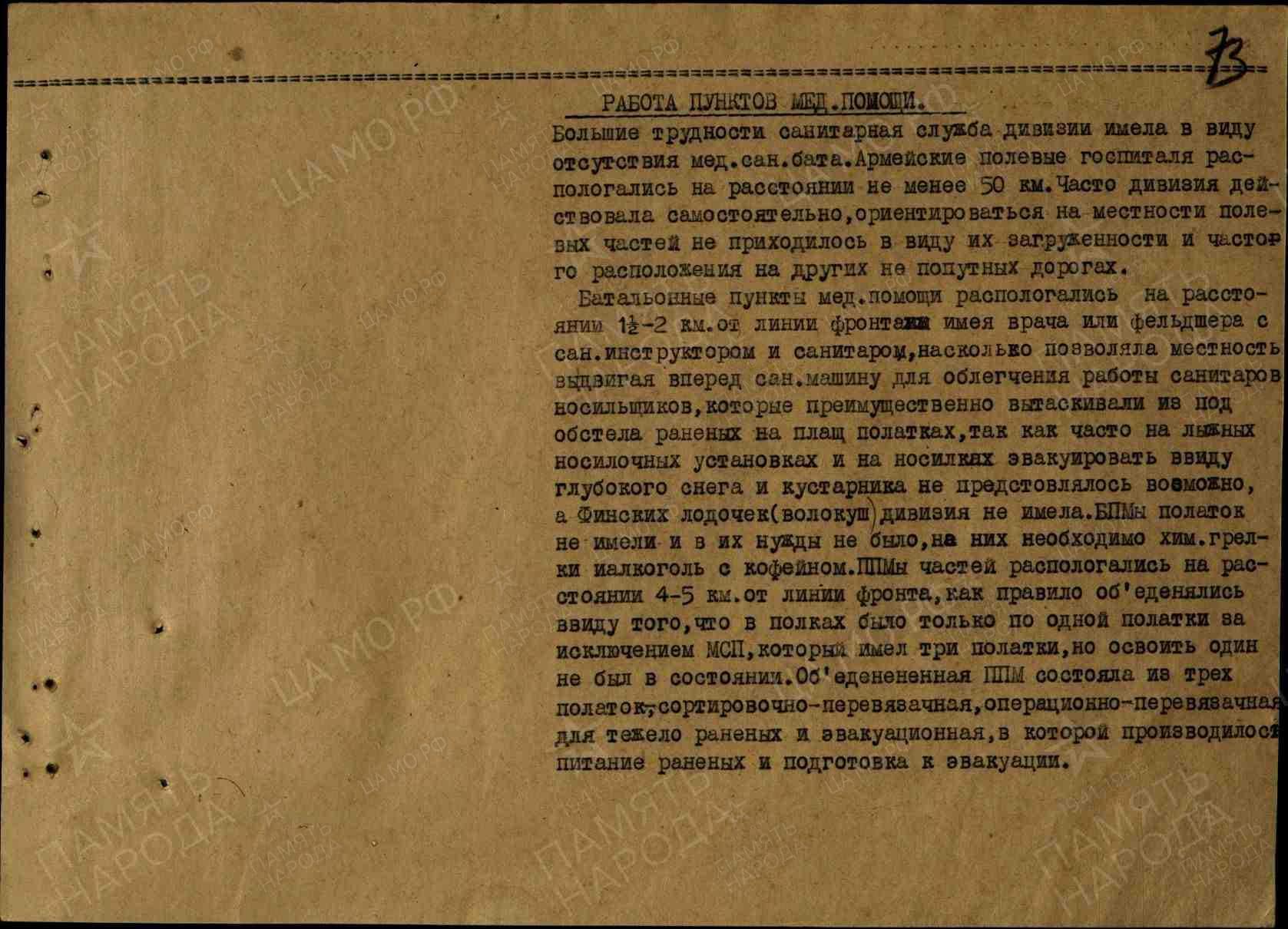 Батальонные пункты мед. помощи располагались на расстоянии 1,5-2 км от линии фронта, имея врача или фельдшера с сан. инструктором и санитаром, насколько позволяла местность, выдвигая вперед сан. машину для облегчения работы санитаров-носильщиков, которые преимущественно вытаскивали из под обстрела раненых на плащ-палатках, так как часто на лыжных носилочных установках и на носилках эвакуировать ввиду глубокого снега и кустарника не предоставлялось возможным, а финских лодочек (волокуш) дивизия не имела.