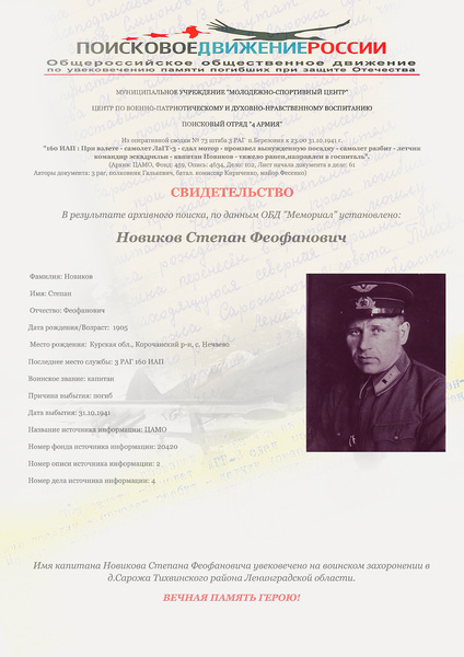 Новиков Степан Феофанович (Федорович-1-й памятник (Фиофанович РВК лётчик первый камень (пост 34, 65 сар (пост 1631 фиш 24.12.1905 сар Памятник ЭГ 1371 майор личка фото похоронка 3.РАГ_ЖБД_31.10.1941 АКТ_151 умер 02.11.1941 160 иап 9557825 35002174 1911212090 260638437 9277022 33125964 ВПП нет подвиг нет