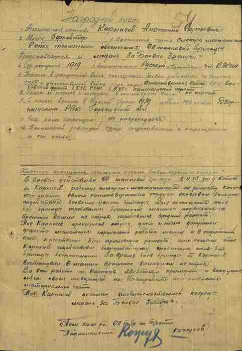 В боевых действиях 60 танковой бригады 09 ноября 1943 года за деревню Котово товарищ Карпачев, работая слесарем-монтажником по ремонту колесных машин, своим самоотверженным трудом оказывал большое содействие боевому успеху бригады.