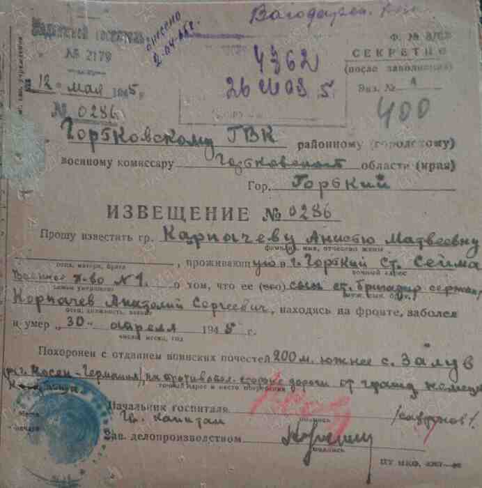 Официальные сведения о месте захоронения (выбытия из строя): Германия город Цоссен, в 200 м южнее села Залув, на противоположной стороне дороги от немецкого кладбища