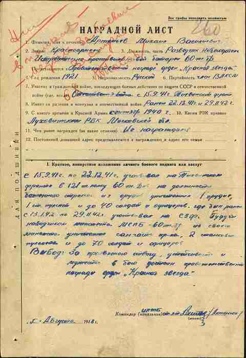 https://pamyat-naroda.ru/heroes/podvig-chelovek_nagrazhdenie17292488/ - документ о награждении воина Медалью "За боевые заслуги" (награжден 06.08.1943)