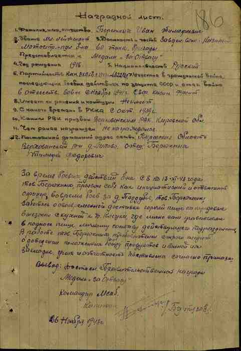 За время боевых действий батальона с 08 по 13 ноября 1943 года товарищ Бережных проявил себя как инициативный и отважный офицер.