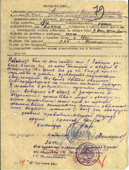Во время боя за станцию Хырув проявил мужество и умение руководить подчиненными ему людей. Во время налета немецких бомбардировщиков на огневые позиции батареи 3 машины в результате пушечного обстрела были выведены из строя и загорелись. Товарищ Абрахманов организовал людей и дважды под огнем противника гасил огонь на горящей машине.