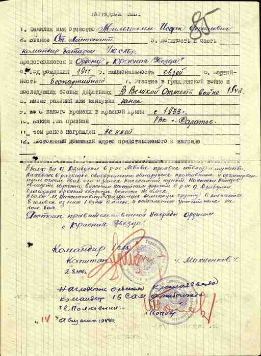 Указан в качестве награжденного Орденом Красной Звезды под номером 7 на основании текста Приказа по 16 Самоходной Артиллерийской бригаде 1 Украинского фронта Nº 3 от 15 августа 1944 года