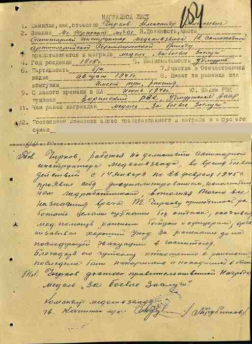 Товарищ Чирков, работая на должности санитарного инструктора медсанвзвода, во время боевых действий с 14 января по 26 февраля 1945 года проявил себя дисциплинированным, исполнительным медработником, выполняя точно все назначения врача.