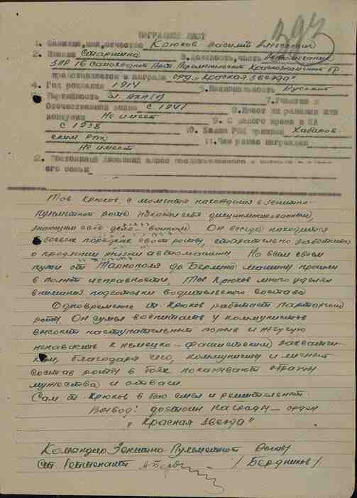 Товарищ Крюков с момента нахождения в зенитно-пулеметной роте показал себя дисциплинированным, знающим свое дело воином. Он всегда находится в боевых порядках своей роты, старательно заботится о продлении жизни автомашины.