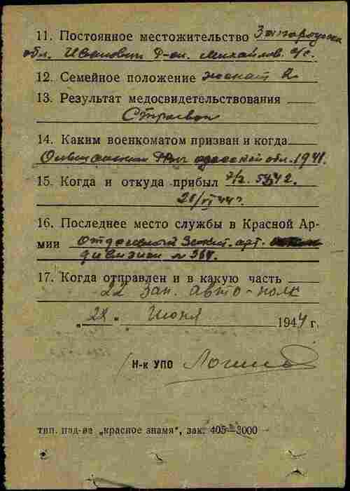 Род занятий, должность, образование, семейное положение, родственники, другая информация: шофер, 5 классов образования; был женат, имел, возможно, 2 детей, до призыва проживал в Украинской ССР (ныне - Украина) Запорожская (возможно, что и Херсонская) область Ивановский район Михайловский с/с