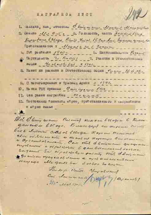 За образцовую работу товарищ Евтушенко достоин представления к правительственной награде Медали "За боевые заслуги".