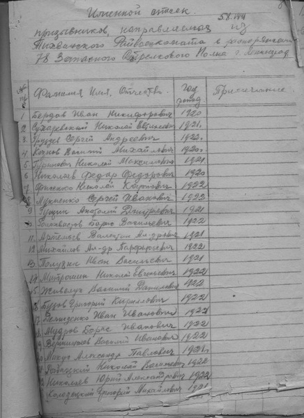 Из: списка призыва и демобилизации ВК Ленинградской обл., Отдел по г. Бокситогорск, Тихвин, Бокситогорскому и Тихвинскому р-нам