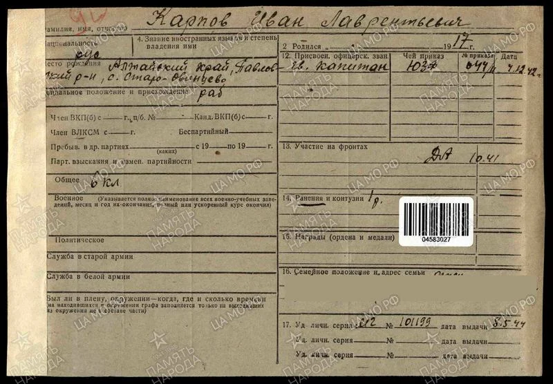 Продолжение на воина «Карпов Иван Лаврентьевич 1917», имеющего следующую архивную историю: