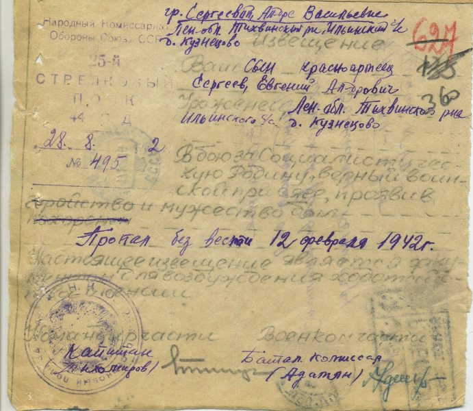 Именная тема, посвящена призывнику Тихвинского РВК «Сергеев Евгений Александрович 1922 (1923», отсутствующего в представленных им списках, однако, имеющего следующую архивную историю: