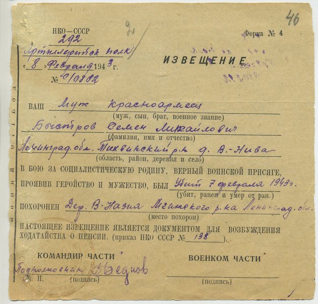 Из извещения боевых частей ВК Ленинградской обл., Отдел по г. Бокситогорск, Тихвин, Бокситогорскому и Тихвинскому р-нам